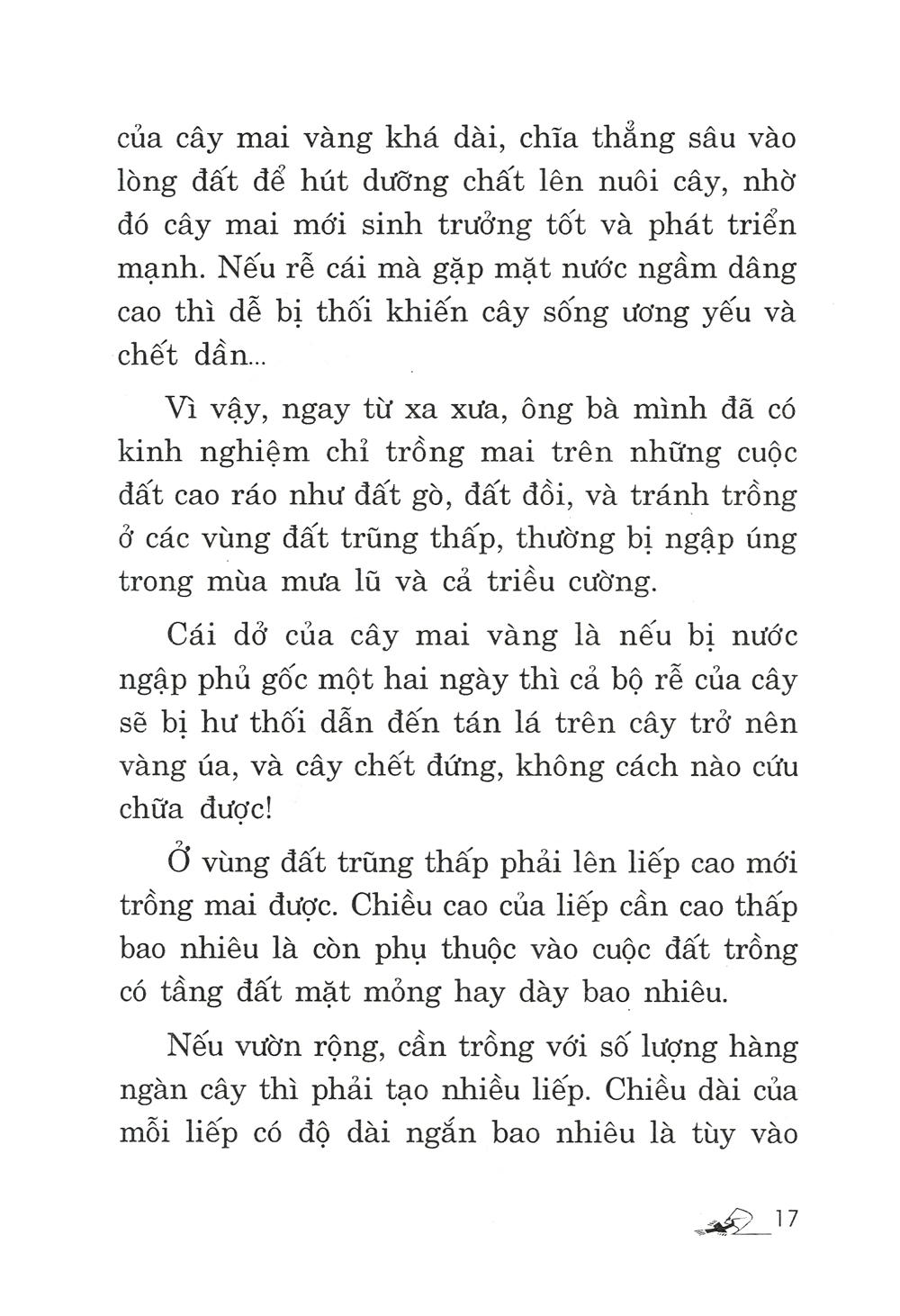 Muốn trồng được những cây mai đẹp đạt giá bán cao ngất ngưỡng như vậy, người làm vườn, tức là nghệ nhân hoa kiểng phải dày công chăm sóc tưới bón, và hằng ngày quan tâm đến việc phòng trị các loài sâu rầy và bệnh hại cho cây. Cuốn sách giới thiệu về kỹ thuật trồng, cách chăm sóc, tưới nước, phòng trừ côn trùng - bệnh hại cho cây mai.