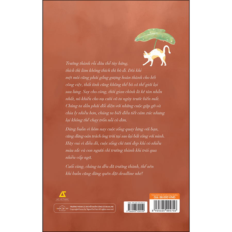 Ngày trước cứ nghĩ rằng lớn lên sẽ thích lắm, muốn làm gì cũng được, không ai quản. Đúng là như vậy, nhưng cái giá phải trả chính là sự cô đơn.  Ngày trước lúc còn vô tư, thơ ngây luôn mộng tưởng cuộc sống trải đầy hoa hồng nhưng những điều hoa mỹ đó đều được sách vở “mài giũa” một cách khéo léo. Ngày trước có thể tuỳ hứng, thích thì làm không thích thì bỏ đi. Nhưng bây giờ, mệt cũng phải gắng gượng hoàn thành cho hết công việc, thất tình cũng không thể bỏ cả thế giới lại sau lưng. Sự trưởng thành ập đến mà không báo trước, tựa cơn mưa ồ ạt đổ ngang, xối xả ồn ào, mãnh liệt gột trôi mọi nét ngây thơ non nớt của mỗi người. Buộc chúng ta phải mang một chiếc ô nhỏ chống đỡ cơn mưa, mang một cái mũ rộng vành che đi giọt nắng gay gắt. Nhưng dù có che chắn tốt đến đâu, vẫn ướt bởi những giọt mưa, vẫn để lại những vết sạm do nắng đi qua. Nếu cuộc sống cho bạn mấy “cú vả nhớ đời” làm bạn mất thăng bằng, muốn buông xuôi tất cả và bỏ rơi bản thân mình thì hãy nhớ rằng: Trưởng thành ấy mà, ai cũng giống nhau, đều phải trải qua những ngày mơ hồ về tương lai, những ngày mang trong mình một nỗi buồn. “Trưởng thành là khi nỗi buồn cũng có deadline” sẽ tưới mát sự cô đơn “héo mòn” từng ngày của bạn, kéo bạn phần nào thoát khỏi cuộc sống khắc nghiệt để giúp bạn nhận ra phía trước còn rất nhiều điều tốt đẹp, bạn không được từ bỏ mọi thứ dễ dàng như thế. Hy vọng bất kể ngày nắng hay mưa, dù vui hay buồn, bạn cũng có thể nở nụ cười tự nhiên nhất, khoác lên mình dáng vẻ yêu thích và trở thành phiên bản độc nhất. Và hãy ghi nhớ rằng “KHI CHÚNG TA TRƯỞNG THÀNH, ĐỪNG QUÊN ĐẶT DEADLINE CHO CẢ NỖI BUỒN”.