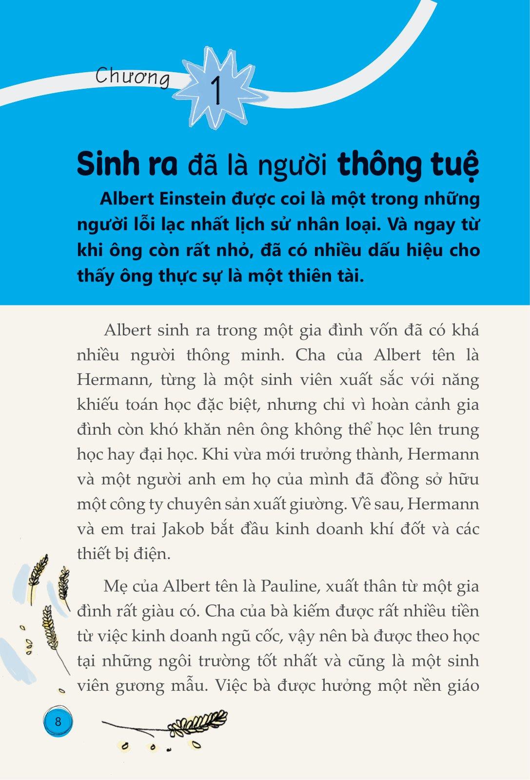 Truyện Kể Danh Nhân Truyền Cảm Hứng - Albert Einstein Albert sinh ra trong một gia đình vốn đã có khá nhiều người thông minh. Cha của Albert tên là Hermann, từng là một sinh viên xuất sắc với năng khiếu toán học đặc biệt, nhưng chỉ vì hoàn cảnh gia đình còn khó khăn nên ông không thể học lên trung học hay đại học. Khi vừa mới trưởng thành, Hermann và một người anh em họ của m.ình đã đồng sở hữu một công ty chuyên sản xuất giường. Về sau, Hermann và em trai Jakob bắt đầu kinh doanh khí đốt và các thiết bị điện.