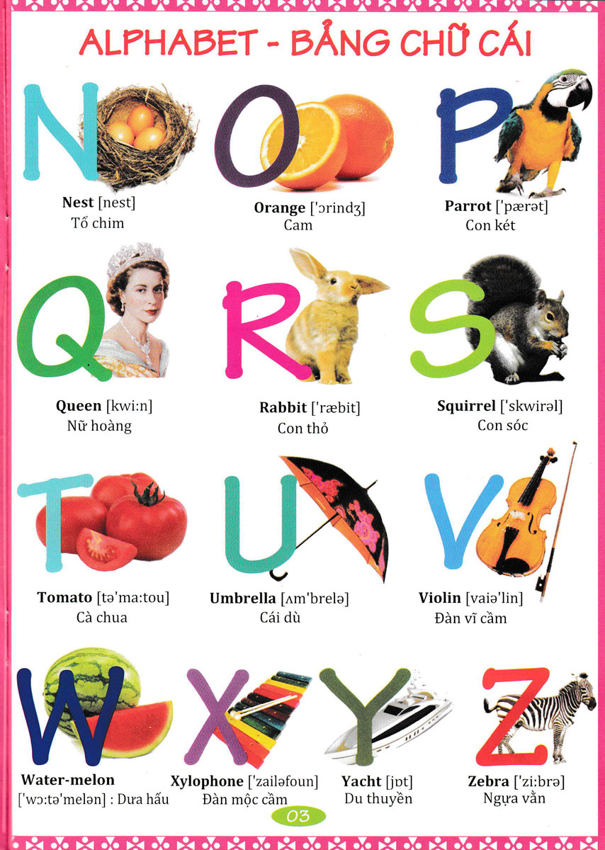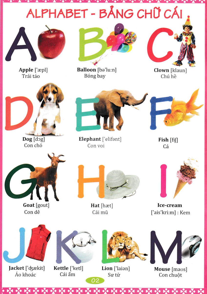 Từ Điển Anh Việt Bằng Hình Ảnh gồm các nội dung: Alphabet - Bảng chữ cái Numbers (1-10) - Số (1-10) Colours - Màu sắc Family - Gia đình The house - Nhà Inside the house - Bên trong nhà Househole items - Đồ dùng gia đình School stationery - Dụng cụ học tập Office - Văn phòng Toys - Đồ chơi Storybook words - Từ trong sách truyện Musical instruments - Nhạc cụ Transport - Giao thông My body - Cơ thể Opposites - Sự đối nghịch People & Profession - Người & Nghề nghiệp Clothes - Trang phục Sports - Thể thao Food & Drink - Đồ ăn thức uống Flowers - Hoa Vegetables - Rau củ Fruits - Trái cây Fish - Cá Birds - Chim Insects - Côn trùng Pets - Thú nuôi kiểng Wild animals - Động vật hoang dã Domestic animals - Động vật nuôi Vegetation - Thực vật Weather - Thời tiết Date - Ngày