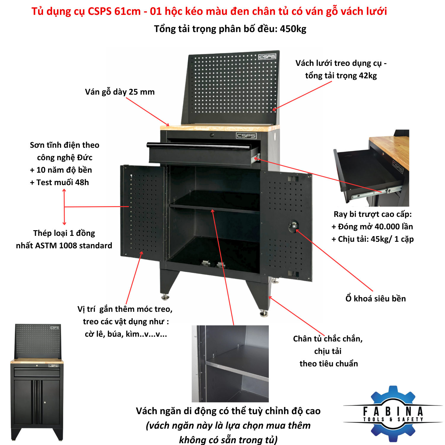 - Tủ dụng cụ CSPS 61cm - 04 hộc kéo màu đen chân tủ ván gỗ vách lưới (tay cầm trắng) - THÔNG SỐ KỸ THUẬT: 1.THÔNG SỐ CHUNG Kích thước đóng gói/ Package dimension:
