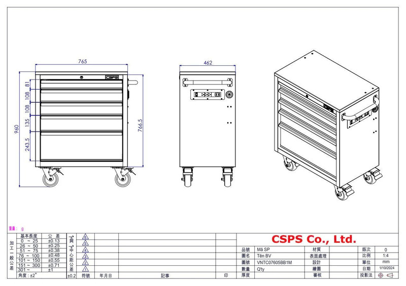 Tủ dụng cụ CSPS 84cm - 04 hộc kéo Kích thước sử dụng: 84cm Rộng x 51cm Sâu x 101cm Cao Khối lượng sử dụng: 52.9 kg Tổng chịu tải: 320 kg Ngăn kéo: 04 ngăn,
