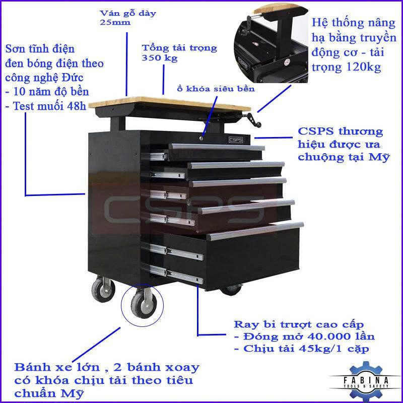 Tủ dụng cụ CSPS 7 ngăn kéo, mặt ván gỗ và vách lưới chất lượng cao. THÔNG SỐ KỸ THUẬT 1 THÔNG SỐ CHUNG Kích thước sản phẩm: 76.4 cm Ngang x 46.2cm Sâu x 96