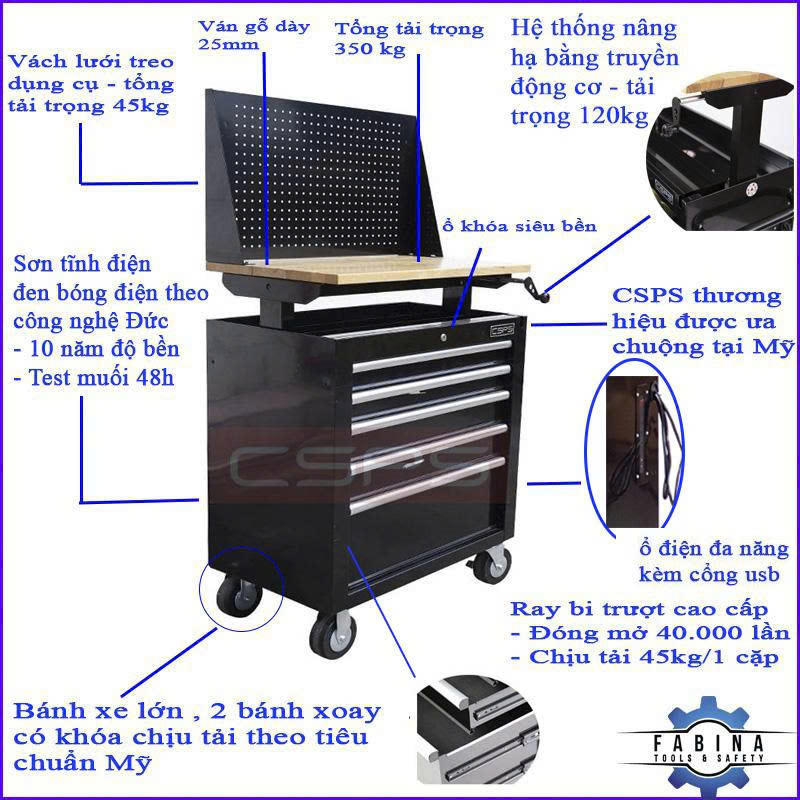 Tủ dụng cụ CSPS 7 ngăn kéo, mặt ván gỗ và vách lưới chất lượng cao. THÔNG SỐ KỸ THUẬT 1 THÔNG SỐ CHUNG Kích thước sản phẩm: 76.4 cm Ngang x 46.2cm Sâu x 96