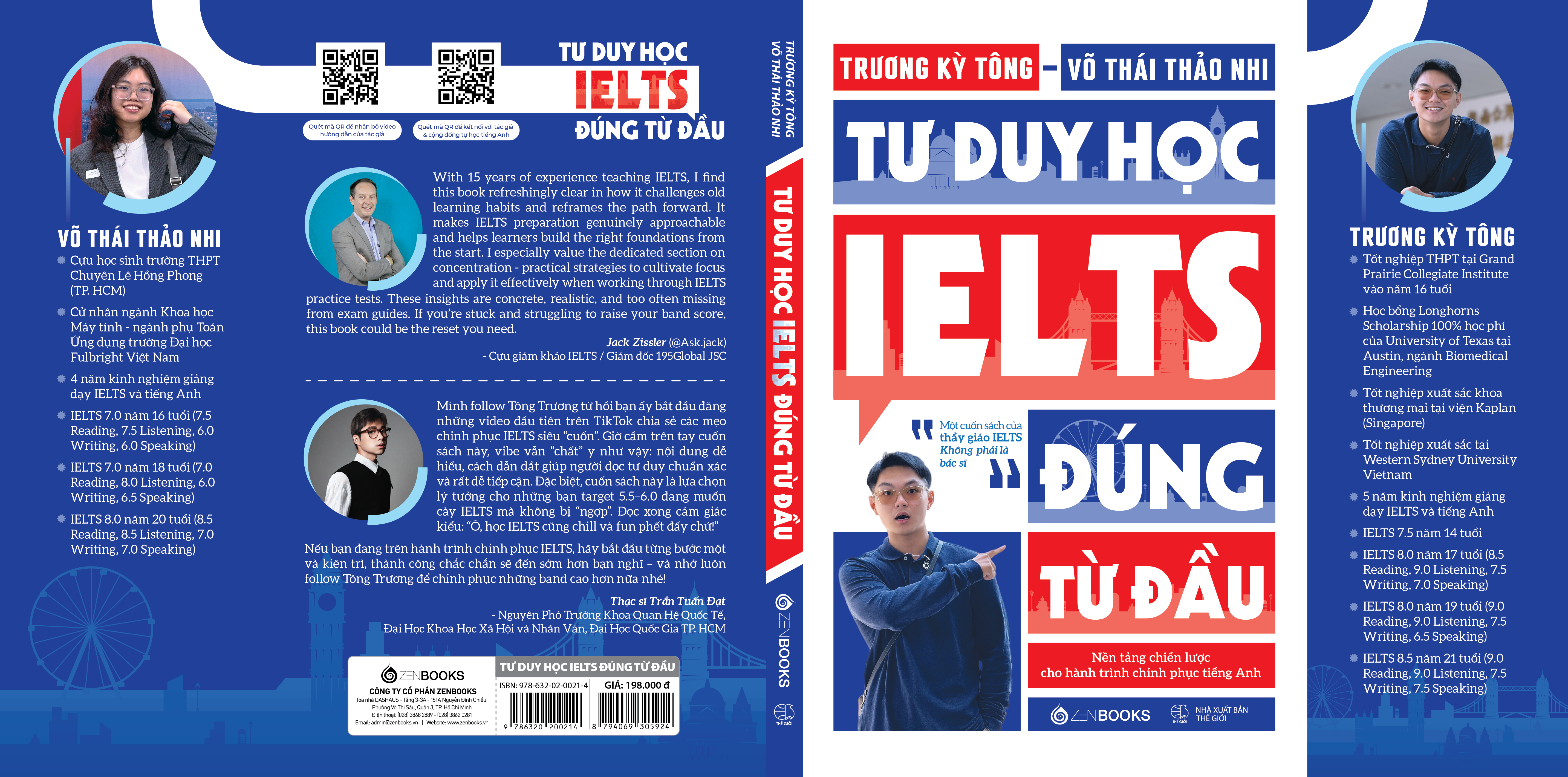 - Cẩm nang hướng dẫn các phương pháp học hiệu quả Tương tự như xây một ngôi nhà, nếu nền móng không vững thì tòa nhà sau khi hoàn thành cũng sẽ rất dễ đổ sụp. Đó là lý do mà nền móng luôn là giai đoạn được ưu tiên và cũng là phần tốn nhiều thời gian nhất. Học IELTS cũng giống như vậy. Nếu từ ban đầu người học không đầu tư cho nền móng, hay nói chính xác hơn là không có phương pháp học đúng chuẩn và hiệu quả, thì giai đoạn về sau sẽ cực kỳ chông gai và khiến bạn dễ dàng bỏ cuộc. Với người mới bắt đầu học IELTS và chưa có cho mình bất kỳ ý tưởng nào về IELTS, như chứng chỉ ngoại ngữ IELTS là gì, dùng vào những mục đích nào, đối tượng nào nên học, hay người chưa biết bắt đầu từ đâu hay đang mông lung trong quá trình học, thì “Tư Duy Học IELTS Đúng Từ Đầu” sẽ là một gợi ý đáng tham khảo. • Hướng dẫn toàn diện 4 kỹ năng IELTS: Listening - Reading - Writing - Speaking, thông qua phương pháp thực tế, dễ áp dụng. • Tư duy học đúng từ đầu: Giúp bạn phản xạ tiếng Anh tự nhiên, không cần dịch trong đầu. • Khắc phục lỗi học sai lầm thường gặp: Vì sao band mãi không tăng, vì sao dùng từ vựng “ngầu” mà vẫn sai? • Kỹ thuật độc quyền: “Tư duy ngược” trong IELTS Reading, “PEEL” cho Writing Task 2, “Chunking” để xử lý số liệu nhanh. • Chương Bonus đặc biệt: Hướng dẫn cách tập trung hiệu quả - một kỹ năng then chốt thường bị bỏ qua. “Tư Duy Học IELTS Đúng Từ Đầu” gồm 6 chương chính và 1 chương bonus. Xuyên suốt quyển sách là những phương pháp định hướng cách học IELTS, cũng như loạt bí quyết làm bài dàn trải đều cho cả 4 kỹ năng IELTS. • Chương 1: Think Like a Native Speaker - Tập tư duy như người bản xứ để nói tự nhiên, không dịch word-by-word. • Chương 2: Tư duy ngược trong IELTS Reading - Biết cách nghĩ ngược để không rơi vào bẫy đề. • Chương 3: Tư duy Gốc (Root-based Thinking) - Cách học từ vựng hiệu quả và ứng dụng vào Writing. • Chương 4: Chững band - Vì sao mãi không tăng? - Giải mã nguyên nhân và cách vượt qua. • Chương 5: Overcompensation - Tại sao “gồng mình” mà vẫn sai? Bỏ thói quen học quá sức nhưng thiếu đúng hướng. • Chương 6: PEEL - Viết Writing Task 2 đúng từ đầu - Công thức viết logic, dễ áp dụng. • Chương đặc biệt: Tập trung như thế nào mới hiệu quả? - Giải pháp rèn luyện sự tập trung trong học tập và làm bài. Sau cuốn sách này, bạn đọc sẽ được tiếp cận đến nhiều phương pháp hiệu quả, khiến cho việc học IELTS trở nên dễ dàng và thú vị hơn. “Tư Duy Học IELTS Đúng Từ Đầu” không chỉ là một tập tài liệu khô khan với lý thuyết, bài tập và lời giải, mà cuốn sách còn chứa đựng nhiều góc nhìn mới từ hai tác giả, khiến cho nội dung trở nên trực quan và sinh động hơn bao giờ hết. Cuốn sách này phù hợp với: ● Học sinh, sinh viên, người đi làm đã học tiếng anh và đang tìm hiểu IELTS ● Các bạn đã và đang luyện IELTS nhưng gặp trường hợp chững band ở tầm cơ bản đến 7.0 ● Các bạn muốn nâng band IELTS nhưng gặp khó khăn trong việc nâng điểm vì thiếu tư duy đúng và phương pháp học phù hợp. Về tác giả: Trương Kỳ Tông, hay còn được biết đến rộng rãi trong cộng đồng học IELTS với biệt danh “Không Phải Là Bác Sĩ”, gây ấn tượng mạnh bởi loạt thành tích khủng: cựu học sinh Chuyên Trần Đại Nghĩa, tốt nghiệp THPT Grand Prairie Collegiate Institute (Mỹ) vào năm 16 tuổi, đạt số điểm gần như tuyệt đối trong kỳ thi IELTS với band 8.5, đối tác chính thức của Hội đồng Anh, sở hữu 5 năm giảng dạy IELTS cho người mới và trung cấp. Trong lần ra mắt này, Kỳ Tông kết hợp cùng tác giả Võ Thái Thảo Nhi - cựu học sinh Chuyên Lê Hồng Phong, để biên soạn nên cuốn sách “Tư Duy Học IELTS Đúng Từ Đầu”. Thảo Nhi cũng là đồng sáng lập Nhà IELTS cùng Kỳ Tông, với loạt thành tích có thể kế đến như IELTS 8.0, 4 năm kinh nghiệm dạy tiếng Anh, cử nhân khoa Khoa học máy tính, ngành phụ Toán Ứng dụng trường ĐH Fulbright Vietnam. Đánh giá từ chuyên gia: Nếu biết đến Tư duy học IELTS đúng từ đầu sớm hơn, chắc chắn ngày xưa mình đã cải thiện điểm nhanh hơn từ mức 4.0. Cuốn sách chỉ ra những thói quen sai phổ biến và đưa ra cách tiếp cận tiếng Anh tự nhiên như người bản xứ. Đây là điều không dễ làm được nếu chỉ học theo cách thông thường, nhưng sách đã giúp người học từng bước sửa những "tật khó bỏ" đó. Với sự thực tế và hài hước, cuốn sách khiến việc luyện IELTS trở nên dễ tiếp cận và bớt áp lực hơn nhiều. - Bùi Thành Việt - IELTS 8.5, tác giả bộ sách IELTS WRITING JOURNEY With 15 years of experience teaching IELTS, I find this book refreshingly clear in how it challenges old learning habits and reframes the path forward. It makes IELTS preparation genuinely approachable and helps learners build the right foundations from the start. I especially value the dedicated section on concentration - practical strategies to cultivate focus and apply it e