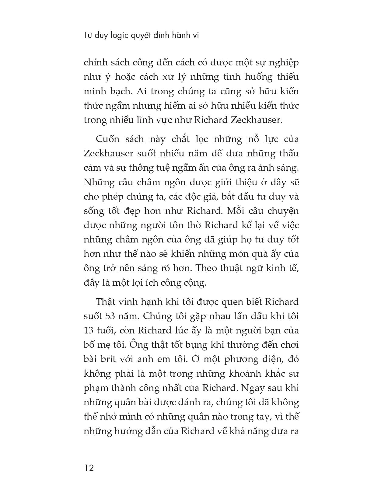 - Về Richard Zeckhauser: Richard Zeckhauser là một nhà kinh tế học người Mỹ và là Giáo sư Kinh tế Chính trị Frank P. Ramsey tại Trường Chính phủ Kennedy thuộc Đại học Harvard. Ông là một người tài năng xuất chúng với những đóng góp quan trọng về lý thuyết kinh tế, kinh tế học công cộng, phân tích quyết định, kinh tế học hành vi và nhiều mảng khác của khoa học xã hội.