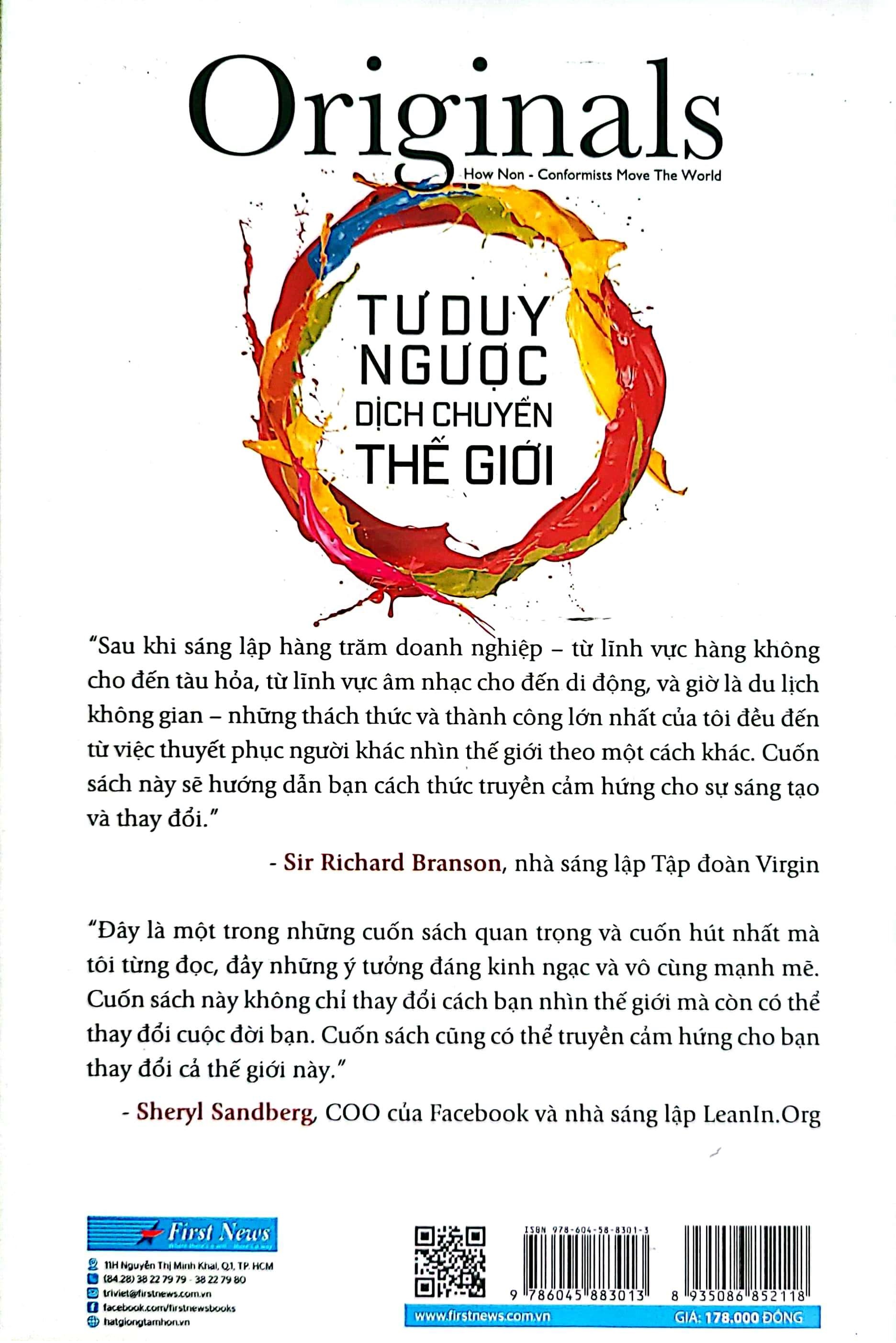Adam Grant là tác giả cuốn Give and take (tựa tiếng Việt là “Cho và nhận), tác phẩm được The New York Times bình chọn là sách bán chạy nhất. Trong Give and take, Adam đã chỉ cho mọi người cách thức để bảo vệ thành công những ý tưởng mới, cũng như phương pháp để các nhà lãnh đạo có thể khuyến khích sự đa dạng và khác biệt trong suy nghĩ và hành động của tổ chức mình. Với Tư duy ngược dịch chuyển thế giới, một lần nữa, Adam Grant lại giải quyết vấn đề làm sao để cải thiện thế giới, nhưng từ góc nhìn mới “trở nên khác biệt”: Chọn đi “ngược dòng”, đấu tranh với tính tuân thủ cứng nhắc và đập tan các truyền thống lỗi thời. Làm sao chúng ta có thể hình thành những ý tưởng, chính sách và thực hành mới mà không phải mạo hiểm một cách mù quáng? Qua những nghiên cứu và câu chuyện đáng kinh ngạc trong lĩnh vực kinh doanh, chính trị, thể thao và giải trí, Grant đã khám phá ra phương pháp để nhận biết một ý tưởng hay, cách lên tiếng mà không bị cô lập, xây dựng liên minh, chọn thời điểm thích hợp để hành động, kiểm soát nỗi sợ hãi và nghi ngờ; cũng như cách thức để các bậc phụ huynh và giáo viên có thể nuôi dưỡng khả năng sáng tạo độc đáo ở trẻ; và giải pháp để các nhà lãnh đạo đấu tranh với tư duy “bầy đàn”. Ngoài ra, độc giả còn có thể học hỏi được kinh nghiệm của một nhà khởi nghiệp gọi vốn bằng cách nhấn mạnh những lý do mà các nhà đầu tư không nên đầu tư. Chẳng hạn một nữ quản lý dưới Steve Jobs ba bậc đã thách thức ông ấy như thế nào, một nhà phân tích ra tay lật ngược quy tắc bảo mật tại CIA, một ông trùm tài chính nắm trong tay hàng tỷ đô-la đã sa thải những nhân viên nào không dám chỉ trích ông, và một giám đốc truyền hình thậm chí còn chẳng biết gì về hài kịch nhưng đã cứu chương trình Seinfeld ra khỏi phòng kiểm duyệt. Phần thưởng của họ là tập hợp những quan niệm và nhận thức đột phá khi từ chối tuân thủ các khuôn mẫu sẵn có và luôn tìm cách cải thiện nguyên trạng. Tư duy ngược dịch chuyển thế giới được COO của Face book Sheryl Sandberg, tỷ phú sáng tạo Richard Branson, tác giả kỳ cựu Malcome Gladwell và nhiều nhà lãnh đạo hàng đầu thế giới đánh giá cao. COO của Face book nhận xét: “Đây là một trong những cuốn sách quan trọng và cuốn hút nhất mà tôi từng đọc, đầy những ý tưởng đáng kinh ngạc và vô cùng mạnh mẽ. Cuốn sách này không chỉ thay đổi cách bạn nhìn thế giới mà còn có thể thay đổi cuộc đời bạn. Cuốn sách cũng có thể truyền cảm hứng cho bạn thay đổi cả thế giới này”. Về tác giả Adam Grant được công nhận là giáo sư hàng đầu trong bốn năm liền của Đại học Wharton, một trong những nhà tư tưởng quốc tế có tầm ảnh hưởng lớn nhất theo tạp chí HR, và nằm trong danh sách 40 giáo sư kinh doanh dưới 40 tuổi tài giỏi nhất thế giới. Cuốn sách đầu tay của Adam Grant, Give and Take (Cho và nhận), là tác phẩm bán chạy nhất theo đánh giá của The New York Times và đã được dịch sang hơn 27 ngôn ngữ. Đồng thời, Give and Take cũng góp mặt trong danh sách những cuốn sách hay nhất năm 2013 của Amazon, Financial Times và Wall Street Journal; Give and Take được Oprah xem là một trong những cuốn sách hấp dẫn nhất và là một trong những ý tưởng làm sắc nét ngành quản trị, theo Harvard Business Review. Adam Grant cũng từng diễn thuyết và tư vấn cho nhiều khách hàng, trong đó có Goo gle, Goldman Sachs, Disney Pixar, Liên Hợp Quốc,…Ông có bằng tiến sĩ của Đại học Michigan và bằng cử nhân của Đại học Harvard.