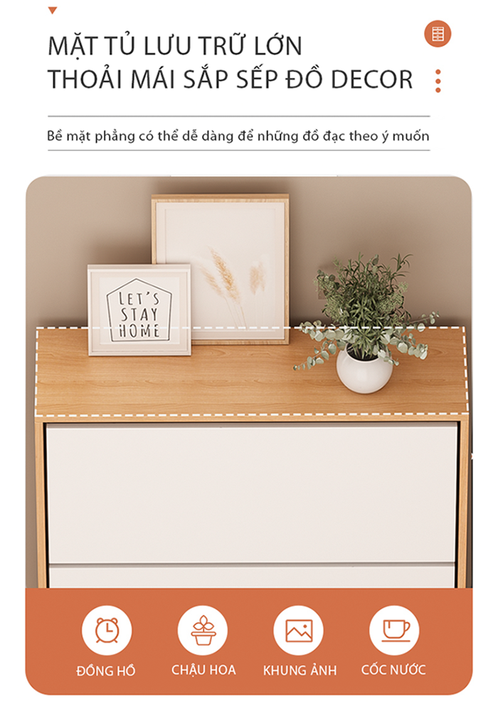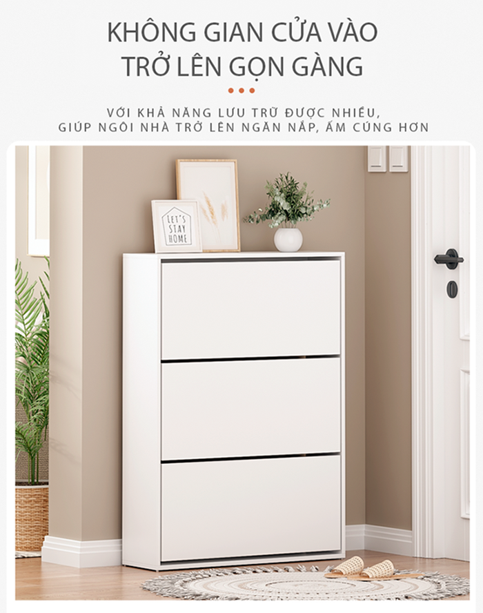 Công năng: Là mẫu tủ giày không thể thiếu trong mọi gia đình. Với thiết kế bản lề lật lưu trữ được nhiều giày và dép tiết kiệm diện tích
