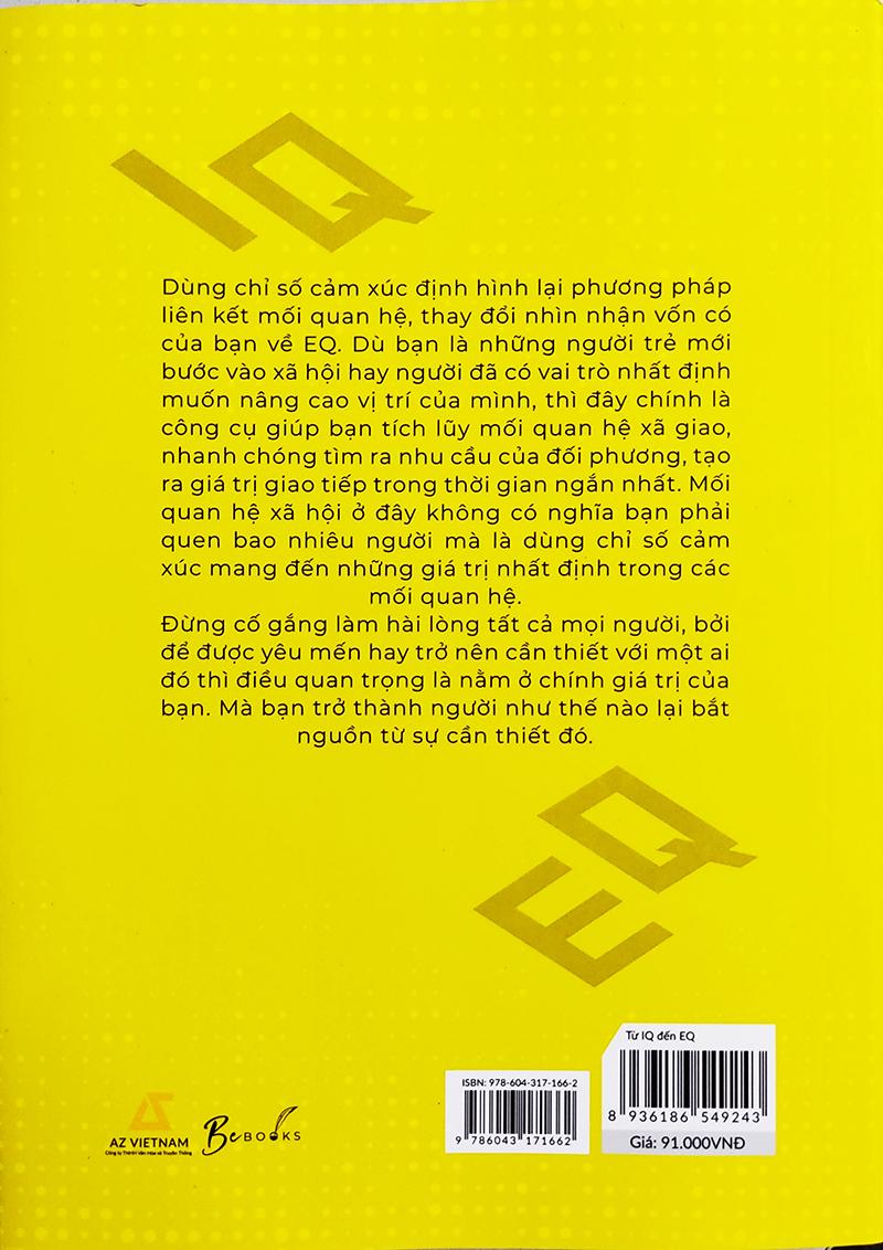 “Từ IQ đến EQ” là cuốn sách sẽ giúp bạn nhận biết và bồi dưỡng trí tuệ cảm xúc của bản thân, định hình và phát triển bản thân, mở rộng mối quan hệ xã giao, cách phá vỡ những cục diện bế tắc, khai thác và vận dụng mối quan hệ xã giao và những kỹ năng để nâng cấp mối quan hệ này một cách tốt đẹp hơn.