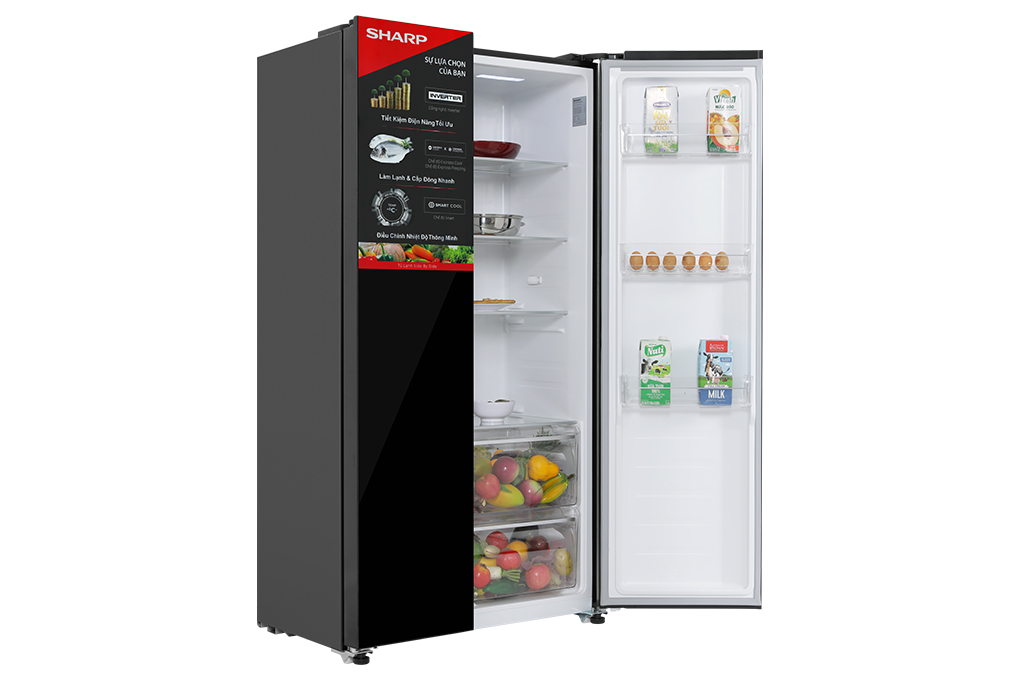 - Sharp Inverter 442 lít SJ-SBX440VG-BK được thiết kế theo mẫu tủ lạnh Side by Side với chất liệu cửa tủ kính màu đen. Điều này tạo nên vẻ đẹp sang trọng cho sản phẩm và có thể đặt ở bất kỳ vị trí nào trong không gian bếp hiện đại của gia đình.