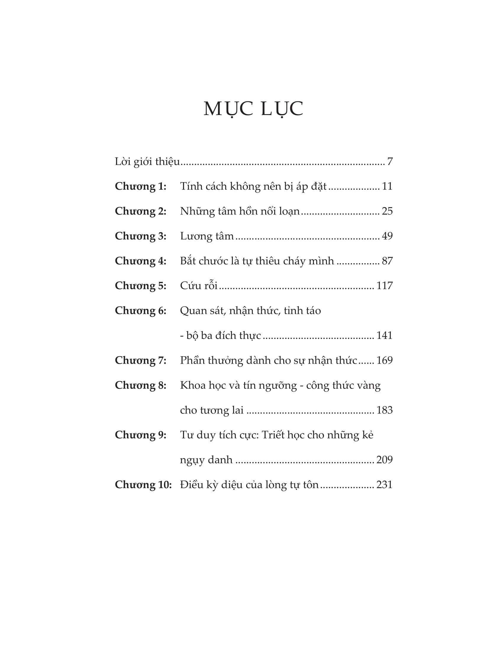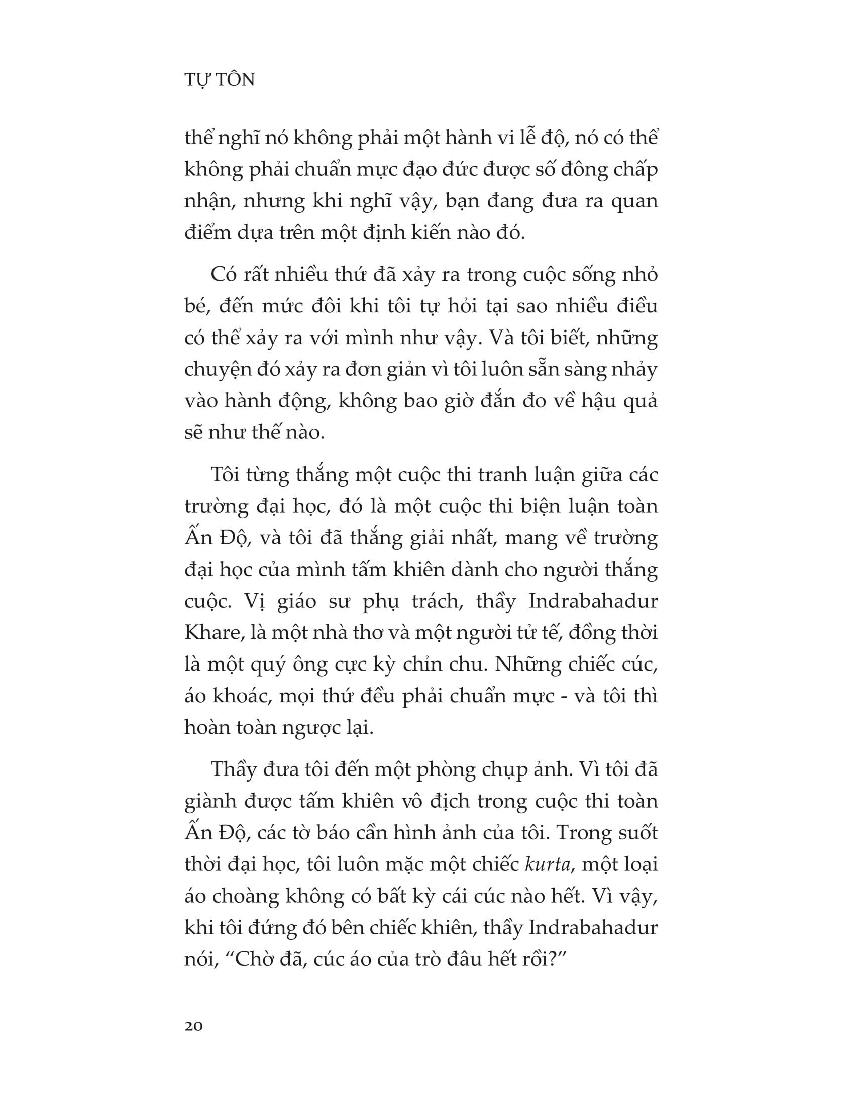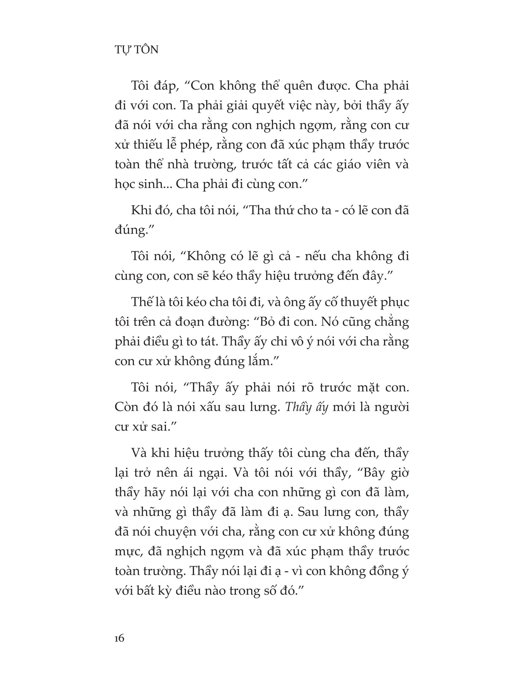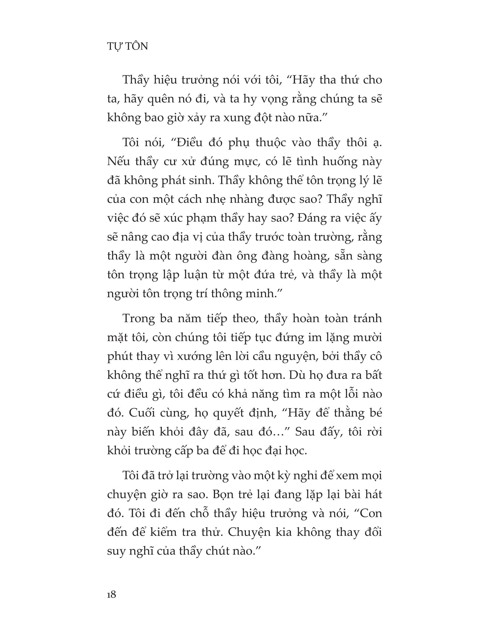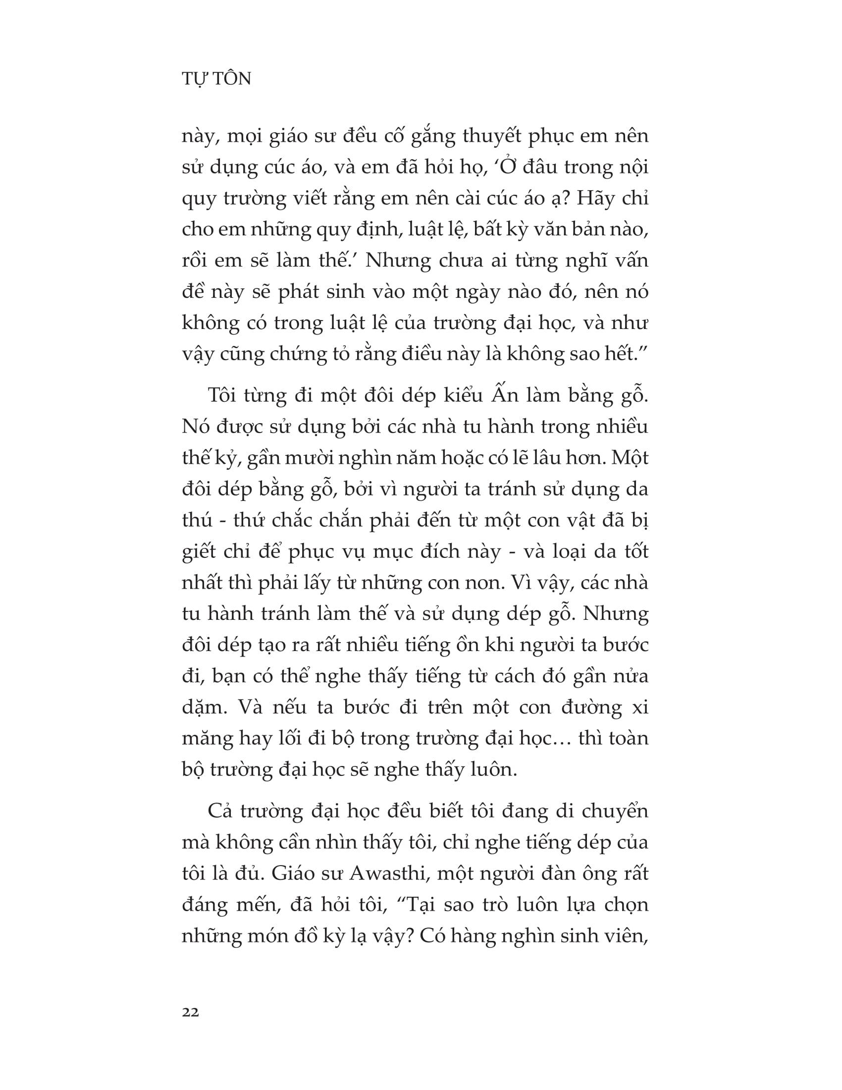 Tự tôn là cuốn sách dẫn đường giúp những linh hồn đang lạc lối tìm lại được điều quan trọng nhất: bản thể chân thật của chính mình. Khi học được cách tôn trọng bản thân đúng nghĩa, chúng ta sẽ thoát khỏi mọi gông cùm về tư tưởng để tự do tung cánh, được bộc lộ trọn vẹn tính cách và năng lượng cá nhân, cũng như sống hòa hợp với tập thể, thanh thản trước mọi thăng trầm của cuộc đời.
