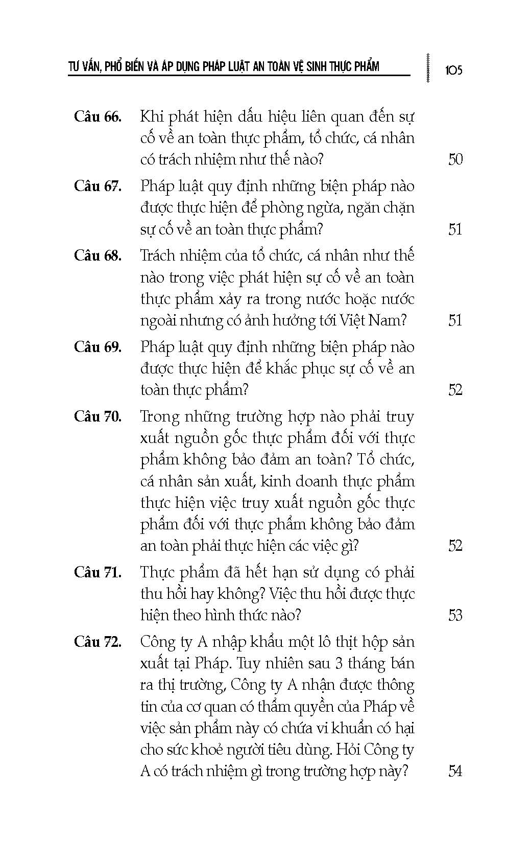 Thực phẩm là những sản phẩm ở dạng tươi sống hoặc đã qua sơ chế, chế biến, bảo quản mà con người ăn, uống hàng ngày. Việc sử dụng thực phẩm là một trong những nhu cầu sinh hoạt tối thiểu của con người… Để đảm bảo an toàn về sức khỏe cho người dân, các cơ quan quản lý nhà nước đã ban hành nhiều văn bản pháp quy, nhất là Luật An toàn vệ sinh thực phẩm, chính thức có hiệu lực và đi vào cuộc sống từ năm 2010. Vấn đề an toàn thực phẩm hiện nay đang được xã hội hết sức quan tâm bởi các vụ vi phạm trong lĩnh vực này có chiều hướng ngày càng gia tăng, gây thiệt hại tới sức khỏe, tính mạng và tài sản của nhân dân cũng như của toàn xã hội. Nguyên nhân thì có nhiều nhưng chủ yếu là ở hai khía cạnh. Trước hết là do hiểu biết về vệ sinh an toàn thực phẩm của xã hội nói chung còn nhiều hạn chế. Bên cạnh đó, do lợi nhuận trước mắt mà nhiều cá nhân và tổ chức bất chấp những quy định của pháp luật, cung cấp cho thị trường các sản phẩm thực phẩm không đảm bảo an toàn, gây nguy hại cho sức khỏe của người tiêu dùng. Do vậy, việc tuyên truyền, giáo dục và phổ biến pháp luật về vệ sinh an toàn thực phẩm là hết sức cần thiết nhằm nâng cao nhận thức và trách nhiệm của các cơ sở sản xuất, kinh doanh thực phẩm, hơn nữa là giúp người dân có thêm hiểu biết để trở thành những người tiêu dùng thông thái khi sử dụng thực phẩm. Cuốn sách Tư vấn, phổ biến và áp dụng pháp luật an toàn vệ sinh thực phẩm được biên soạn nhằm cung cấp cho độc giả những kiến thức cơ bản nhất về pháp luật vệ sinh an toàn thực phẩm, từ định nghĩa các loại thực phẩm cho đến trách nhiệm của các chủ thể trong việc đảm bảo an toàn vệ sinh thực phẩm cùng các khung pháp lý hiện hành theo quy định của pháp luật Việt Nam.