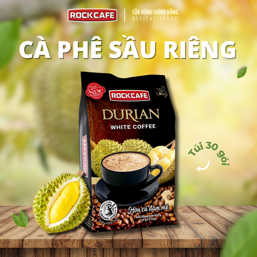 Cà phê sầu riêng - Rockcafe Durian White coffee là sự kết hợp giữa cà phê trắng với vị sầu riêng ngọt bùi. So với vị đắng đậm đà của cà phê đen có thể át đi mùi vị của sầu riêng thì cà phê trắng với vị chua nhẹ và ít vị đắng sẽ giúp bạn có thể cảm nhận được vị cà phê trong khi vẫn có thể nếm được vị ngọt bùi đặc trưng của sầu riêng.
