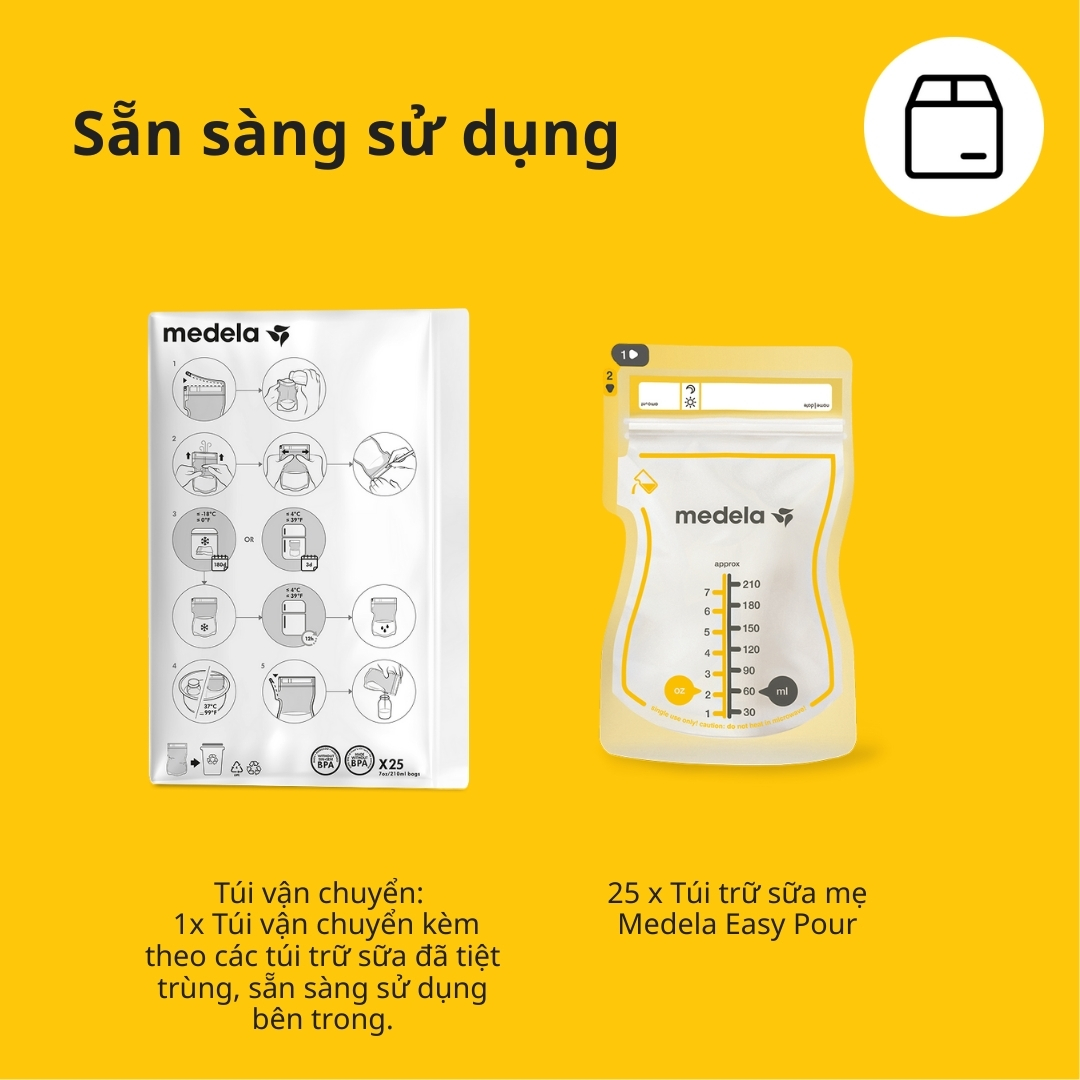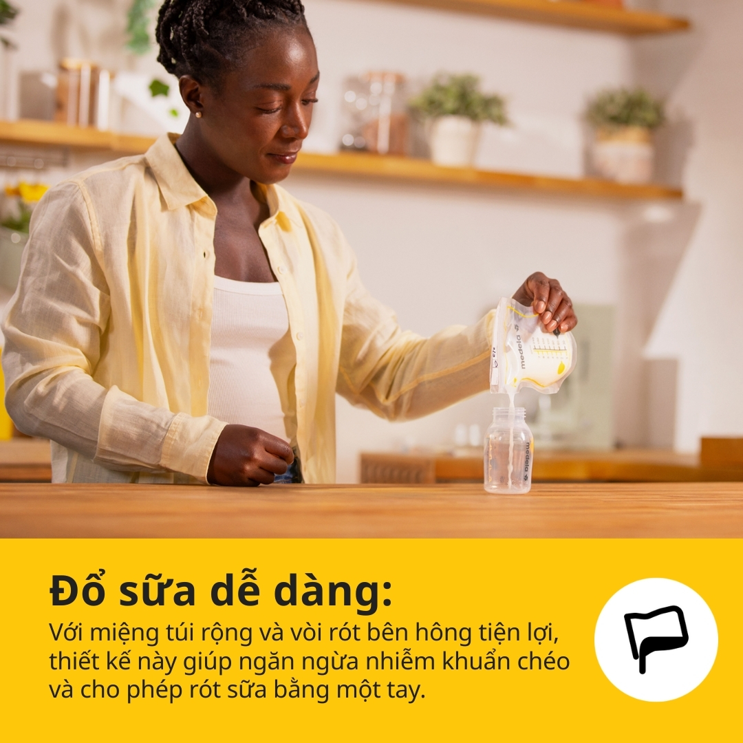 【TÚI TRỮ SỮA MEDELA EASY POUR】 Dùng túi trữ sữa Easy Pour để bảo quản sữa mẹ vừa vắt trong tủ lạnh hoặc tủ đông. Thiết kế miệng túi độc quyền giúp rót sữa dễ dàng, hạn chế tràn đổ hay nhiễm khuẩn chéo. 【Đặc điểm nổi bật】 Rót sữa bằng một tay thật dễ dàng – 85% mẹ đồng ý: Thiết kế miệng túi độc quyền giúp hạn chế tràn sữa và tránh lây nhiễm chéo. Bảo vệ dưỡng chất trong sữa mẹ với chất liệu dày dặn đặc biệt. Hoàn toàn không rò rỉ – 98% mẹ đồng ý Tiết kiệm không gian bảo quản: Thiết kế có thể đặt nằm phẳng hoặc đứng vững trong tủ lạnh/tủ đông – 76% mẹ đồng ý Thân thiện môi trường: Có thể tái chế, làm từ một loại vật liệu duy nhất, không cần rửa trước khi bỏ. Sẵn sàng sử dụng: Đã được tiệt trùng và đóng gói trong túi vận chuyển. Dễ dàng sắp xếp: Có vạch chia thể tích rõ ràng và chỗ ghi ngày giờ lượng sữa. Không chứa BPA – an toàn cho mẹ và bé. Khảo sát người tiêu dùng được thực hiện bởi đơn vị độc lập vào tháng 11 năm 2023 【Phân loại đóng gói】 Có thể lựa chọn giữa 2 phân loại: 25pcs/ hộp hoặc 50pcs/ hộp 【Dung tích】 Dung tích của túi trữ sữa Medela Easy Pour là 210ml (7oz) Xuất xứ : Trung Quốc Thương hiệu Medela Bao bì sản phẩm có thể thay đổi tùy từng lần nhập hàng.