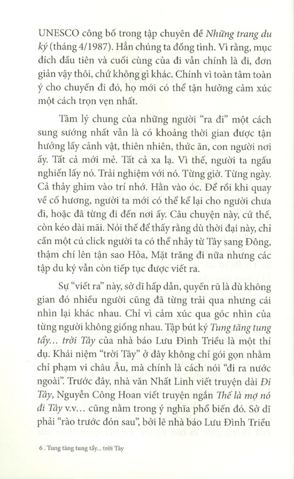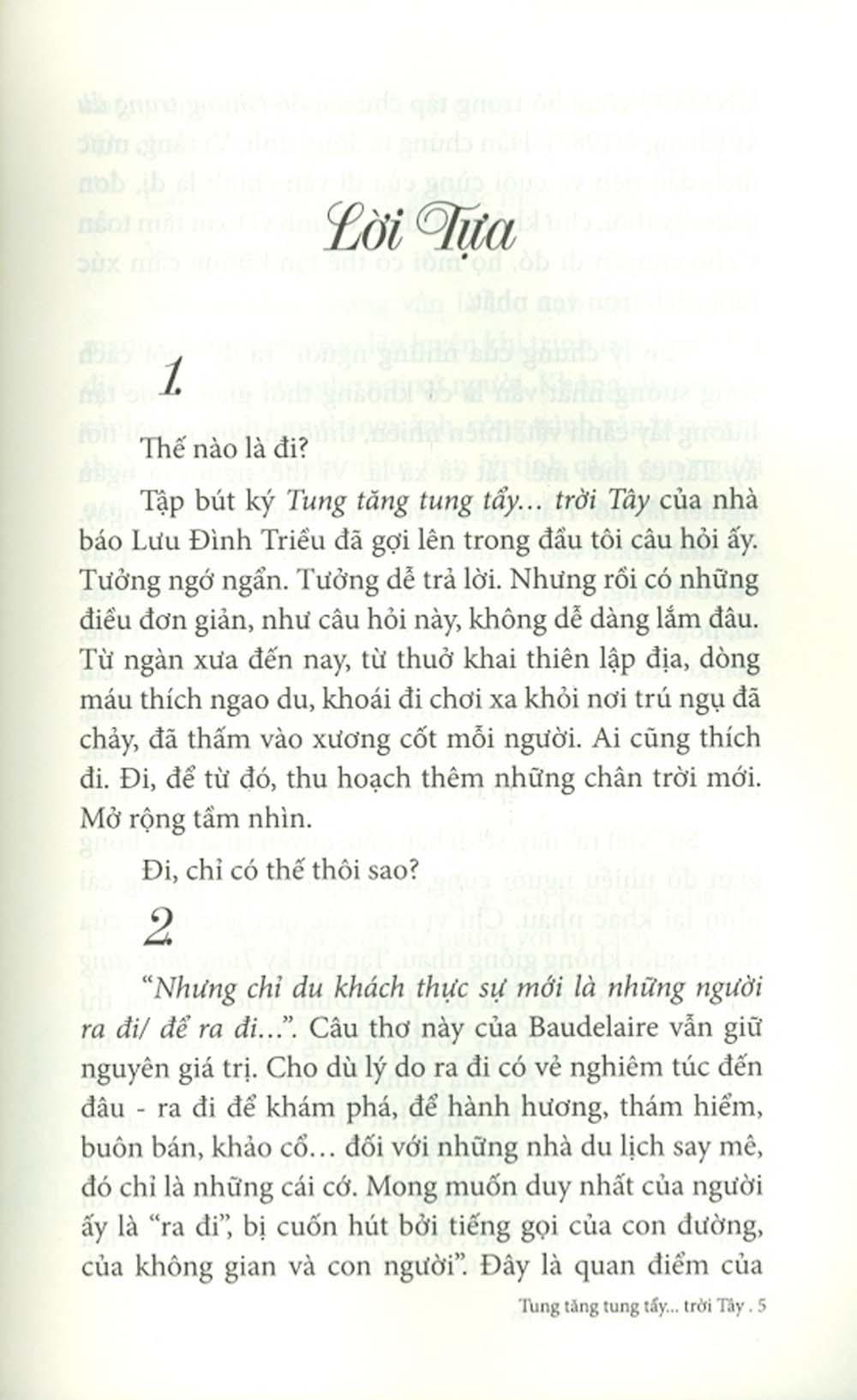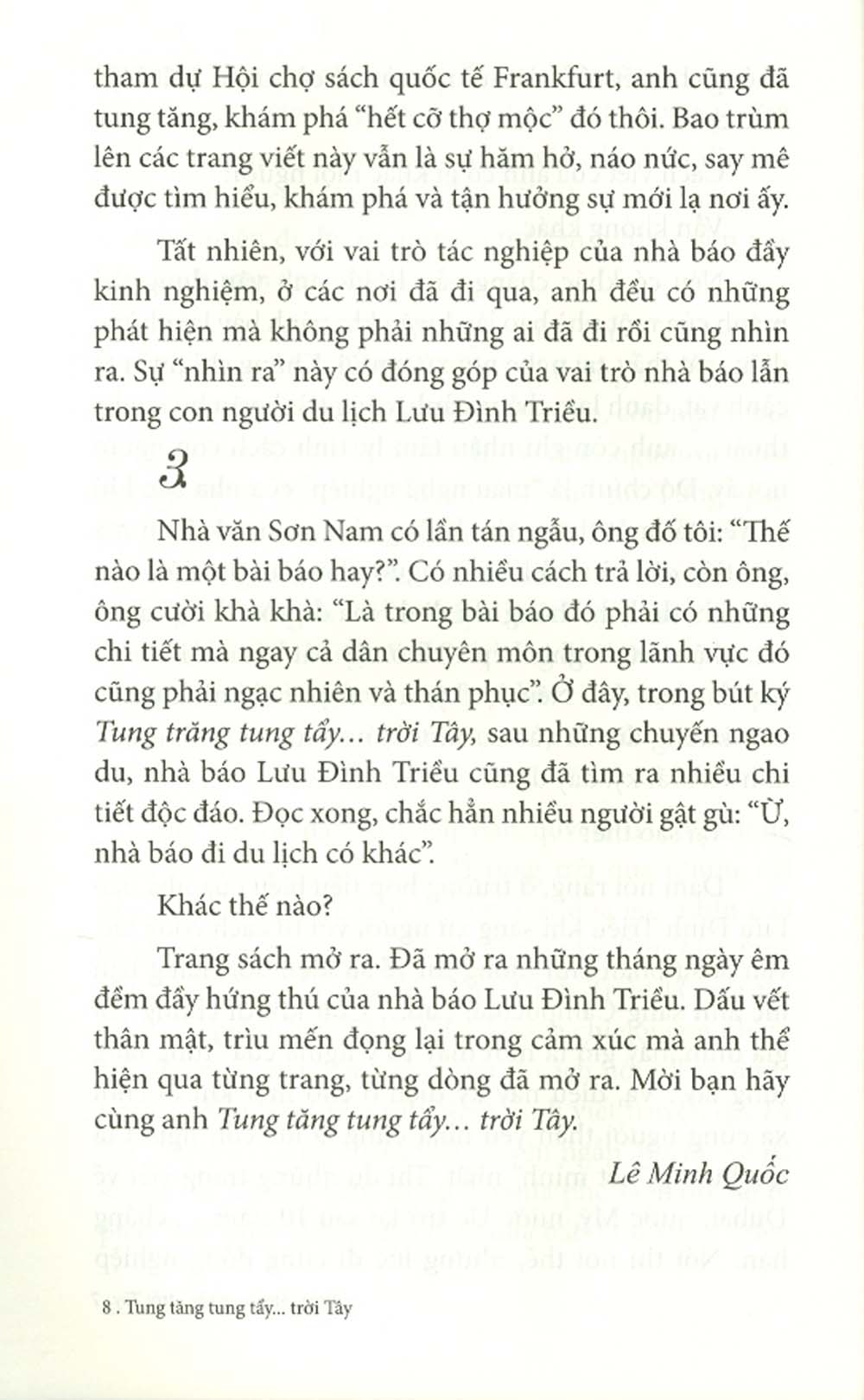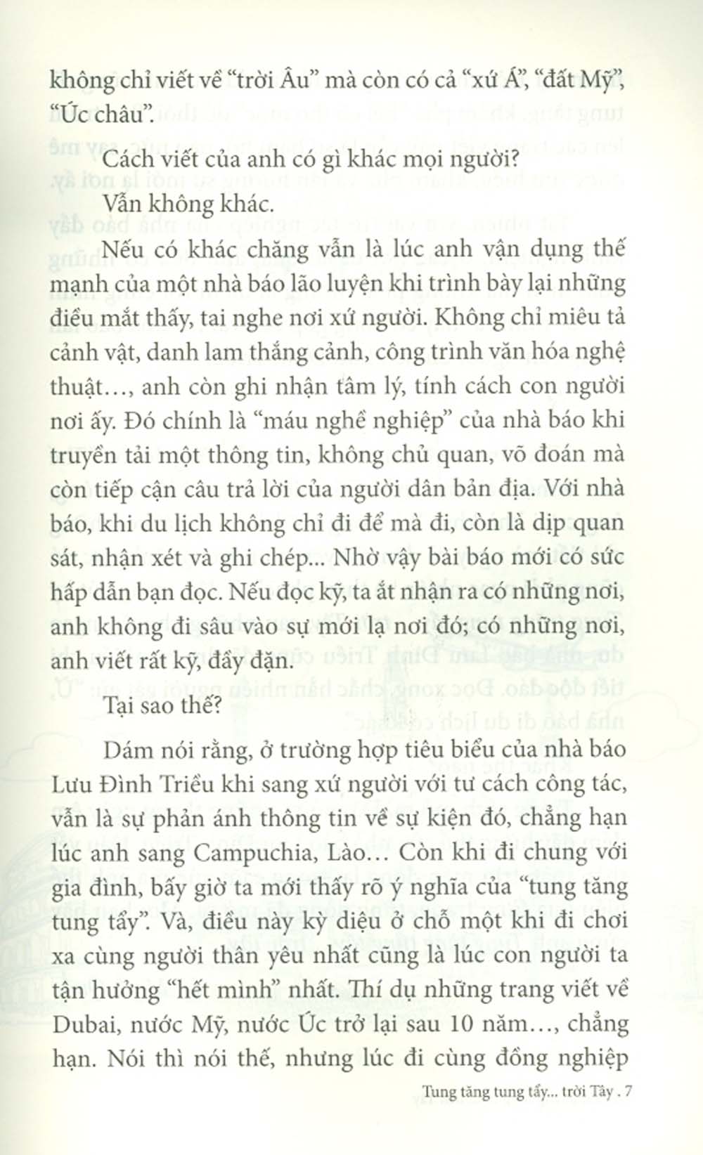 Tập bút ký "Tung tăng tung tẩ trời Tây" của nhà báo Lưu Đình Triều không chỉ miêu tả cảnh vật, danh lam thắng cảnh, công trình văn hóa nghệ thuậ anh còn ghi nhận tâm lý, tính cách của con người nơi ấy. Đó chính là "máu nghề nghiệp" của nhà báo khi truyền tải một thông tin, không chủ quan, võ đoán mà còn tiếp cận câu trả lời của người dân bản địa. Với nhà báo, khi du lịch không chỉ đi để đi, mà còn là dịp quan sát, nhận xét và ghi ché