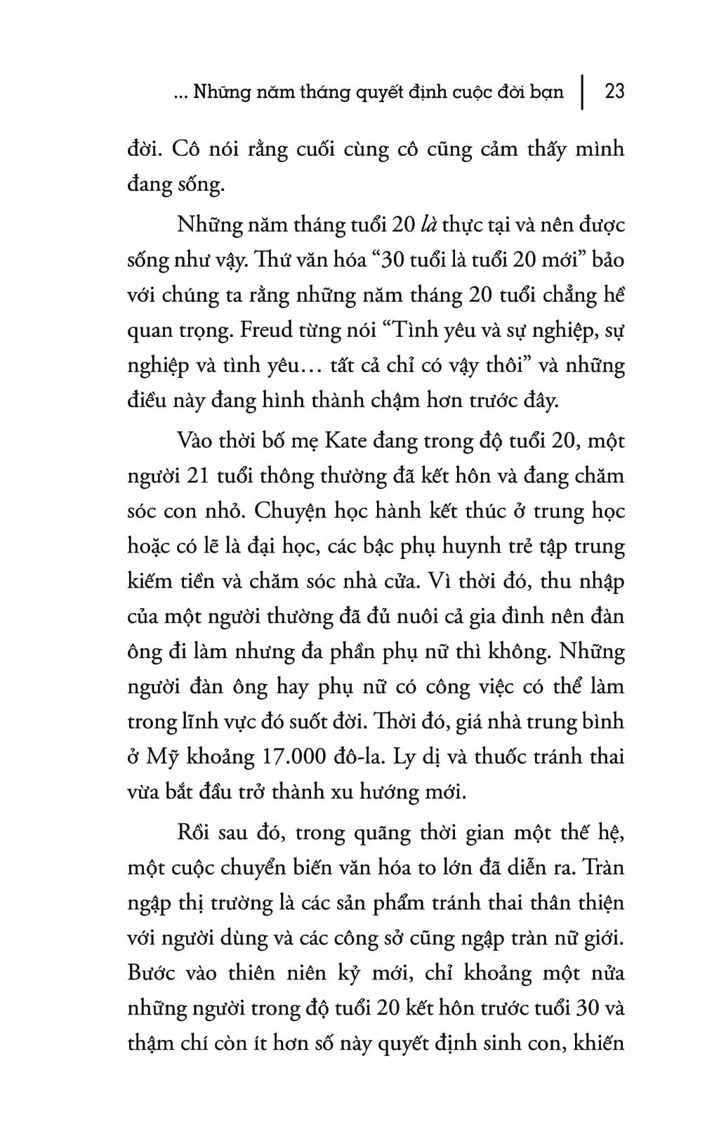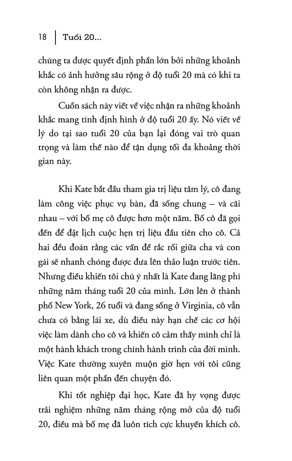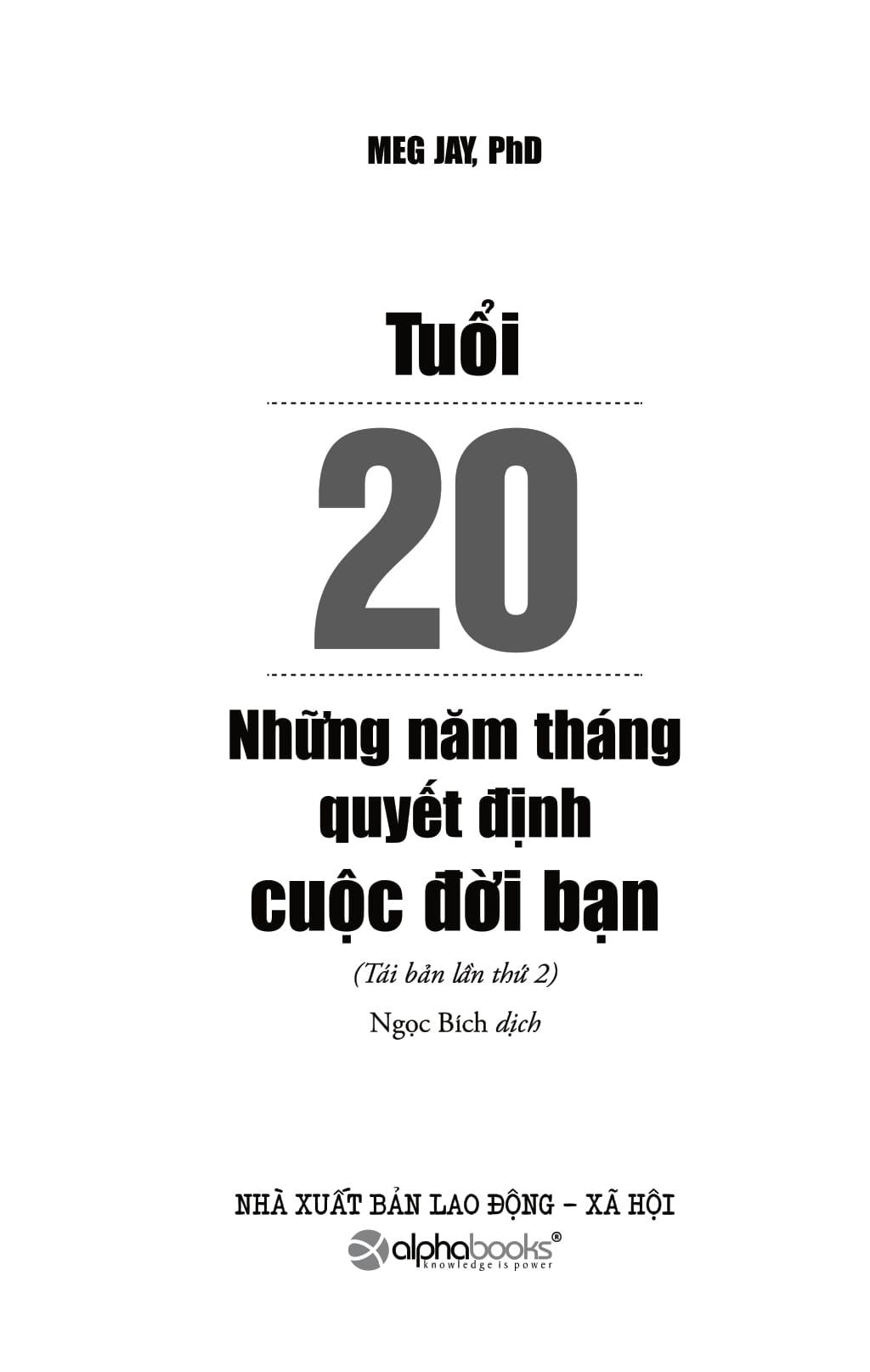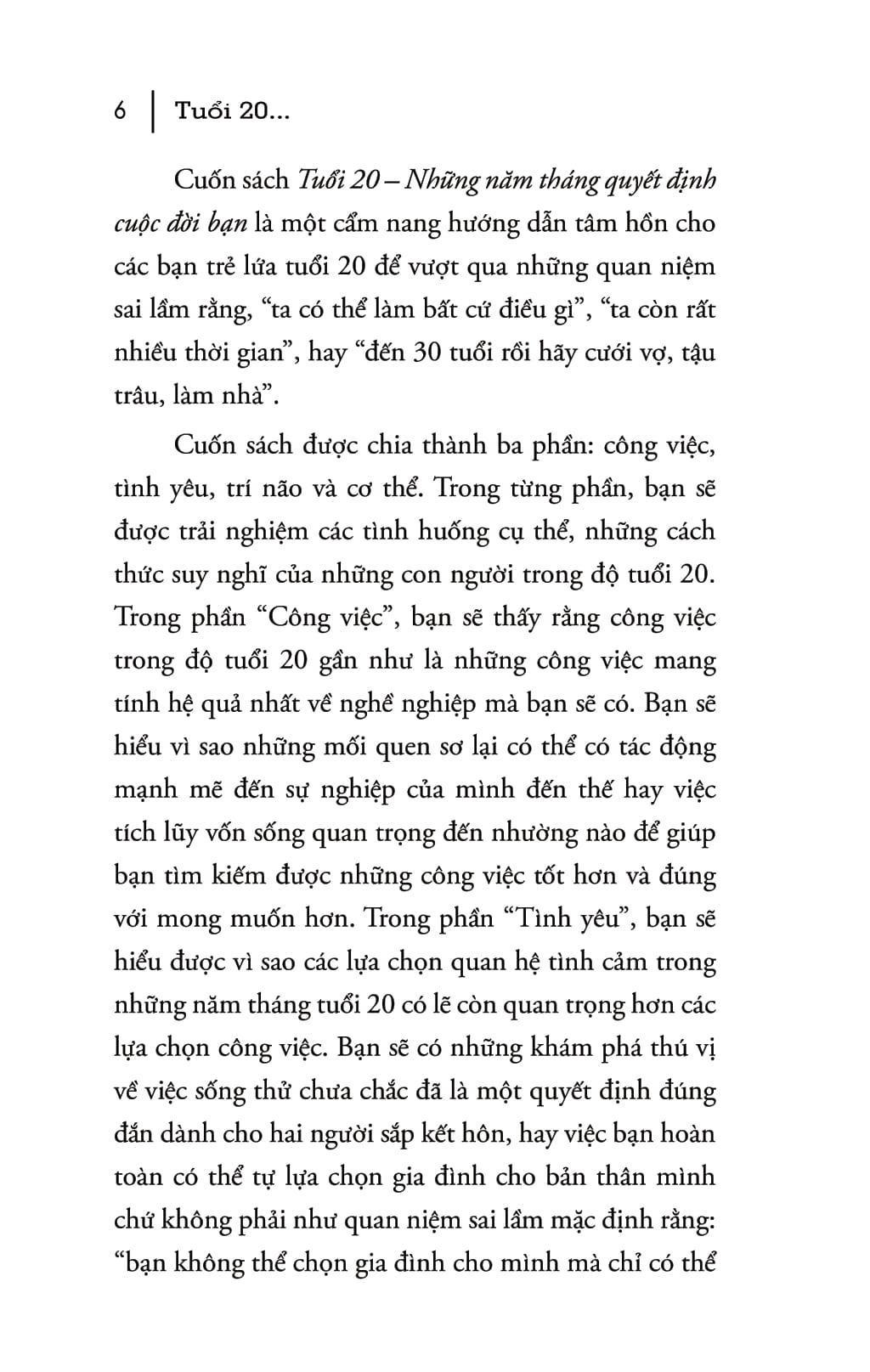 Tuổi 20 - Những Năm Tháng Quyết Định Cuộc Đời Bạn (Tái Bản 2018) là cuốn sách kỹ năng hữu ích dành cho những bước chân chênh vênh vào đời của tuổi 20. Những năm tháng của tuổi 20 là một sự cải tổ vĩ đại. Đây là những năm tháng ta có thể bắt đầu cuộc đời mà ta hằng mong muốn một cách dễ dàng nhất, là giai đoạn khi các trải nghiệm ta có được sự ảnh hưởng bất cân đối nhất đến cuộc đời trưởng thành của ta sau này. Tuổi 20 – Những năm tháng quyết định cuộc đời bạn là cuốn sách vô cùng lý thú và tâm lý, sẽ giúp chúng ta hiểu được rằng tính cách của mình thay đổi trong độ tuổi 20 nhiều hơn bất kỳ giai đoạn nào khác trong cuộc đời. Tuổi 20 – Những năm tháng quyết định cuộc đời bạn sẽ giải đáp cho ta những khúc mắc về sự thay đổi trong ta ở độ tuổi 20, giúp ta biết được mình nên làm thế nào để có thể vững vàng bước qua tuổi 20, để có được những năm tháng vô cùng ý nghĩa. Hãy bắt đầu bằng cách tìm hiểu vì sao câu trả lời hay nhất cho câu hỏi "Tôi là ai" không phải là một cuộc khủng hoảng danh tính kéo dài mà là một vài mảnh ghép của cái gọi là vốn sống.