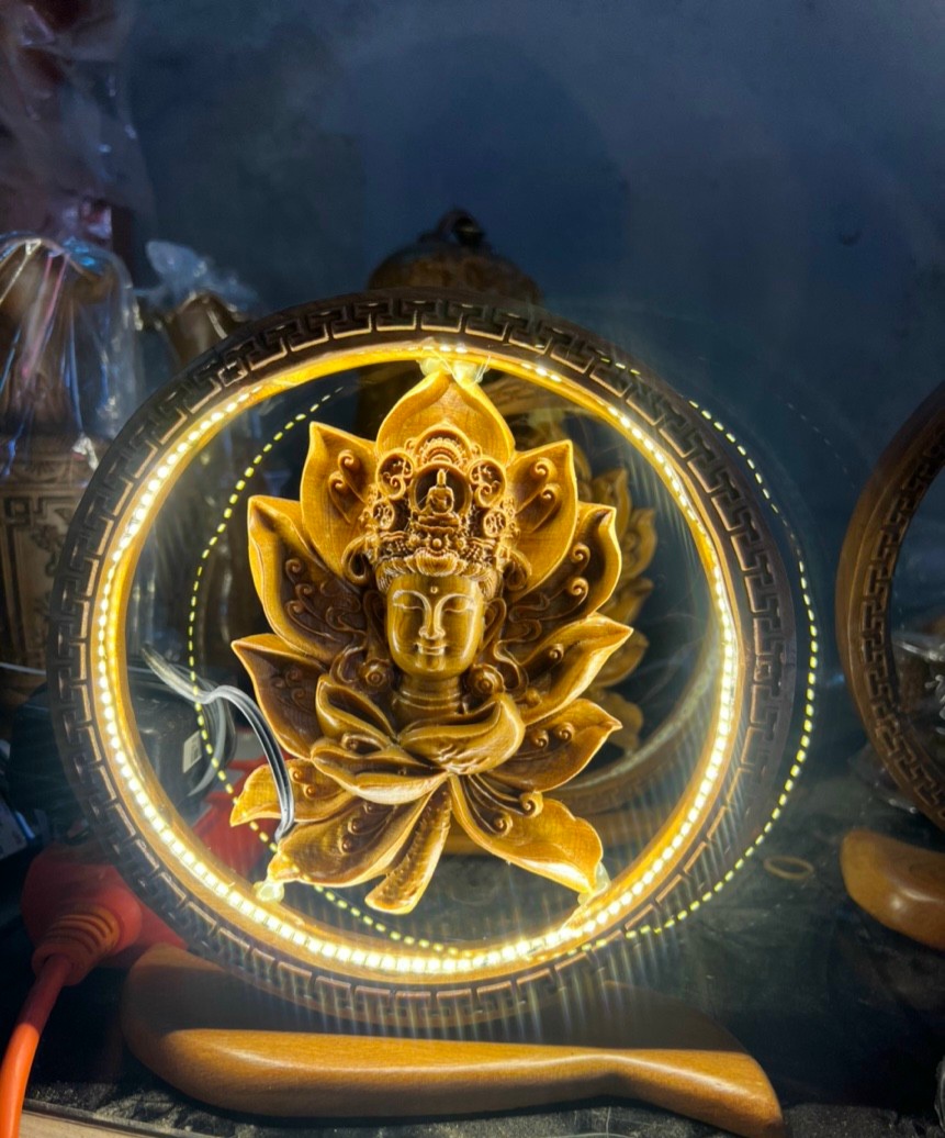 Diện phật được làm bằng chất liệu gỗ hương đá tự nhiên 100% Kt tròn 20×20×6cm _ Diện phật được trạm khắc tỉa mỉ ,tinh sảo kỳ công à được lắp thêm bóng đèn viền thắp sáng lúc tối ,Đi hầu hết tất cả mọi chi tiết góc ngách nội dung hoa văn của tượng đều được gọt tỉa chỉnh sửa hoàn toàn bằng tay thủ công .Diện phật được làm và hoàn thiện do bàn tay khối óc tài hoa .Từ những người thợ dầy dặn kinh nghiệm cũng như tay nghề cao trong làng nghề truyền thống .Chính vì thế diện phật bằng gỗ hương đã đáp ứng đầy đủ mọi tiêu trí cần thiết như ,( Đẹp bền rẻ ) Thẩm mỹ nghệ thuật với chất lượng tuyệt vời