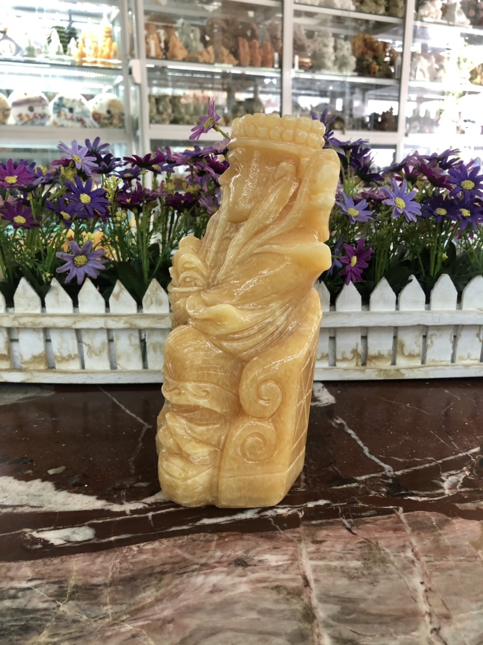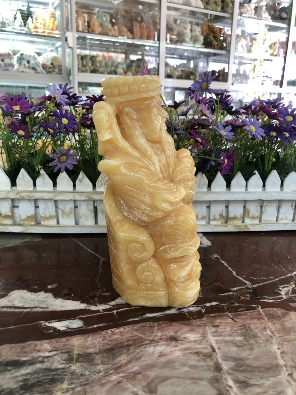Chất liệu: Đá ngọc hoàng long Kích thước: Dài 15 cm x Rộng 10 cm x Cao 20 cm Khối lượng: 4,4 kg Thần Tài là vị thần trông coi tiền tài, vàng bạc, mang