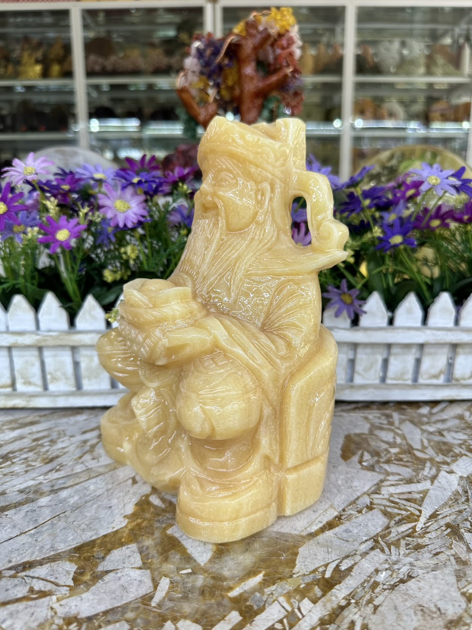 Chất liệu: Đá ngọc hoàng long Kích thước: Dài 15 cm x Rộng 10 cm x Cao 20 cm Khối lượng: 4,4 kg Thần Tài là vị thần trông coi tiền tài, vàng bạc, mang