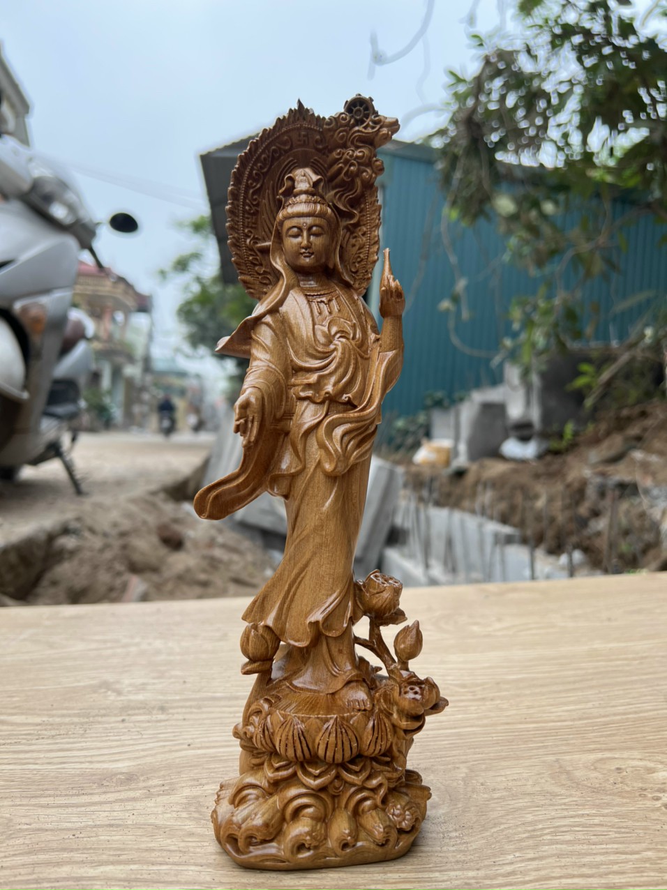 Tượng phật bà quan âm bồ tát được làm bằng chất liệu gỗ bách xanh liền khối tự nhiên 100% ,Và được sơn pu phun bóng mờ giữ lại mầu sắc vân gỗ tự nhiên  Kích thước cao 30×8×9cm _ Tượng phật bà quan âm bồ tát được trạm khắc vô cùng tỉ mỉ tinh sảo kỳ công .Đi hầu hết tất cả mọi chi tiết góc ngách của tượng đều được ngọt tỉa chỉnh sửa hoàn toàn bằng tay thủ công .Đồng thời tượng được kiểm định rất kỹ lưỡng như là cho vào thẩm sấy cho gỗ khô kiệt .Mục đích trống dập nứt vênh mo mối mọt  ,Tượng phật bà quan am bồ tát được làm và hoàn thiện do bàn tay khối óc tài hoa từ những người thợ giàu kinh nghiệm ,Cũng như tay nghề cao trong làng nghề truyền thống .Chính vì thế tượng phật bà quan âm bồ tát đã đáp ứng đầy đủ những tiêu trí ( Đẹp bền rẻ ) Thẩm mỹ nghệ thuật với chất lượng tuyệt vời