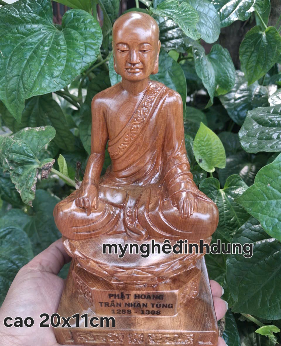 Tượng phật hoàng trần nhân tông được làm bằng chất lượng gỗ bách xanh liền khối tự nhiên 100% Kt cao 20x11cm _ Tượng được chạm khắc vô cùng tỉ mỉ tinh xảo kỳ công. ĐI HẦU hết tất cả mọi chi tiết góc ngách nội dung hoa văn của tượng đều được gọt tỉa chỉnh sửa sắc nét hoàn toàn bằng tay thủ công truyền thống.