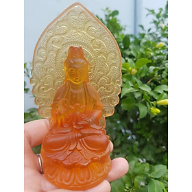 TƯỢNG PHẬT BÀ QUAN ÂM 2 MẶT ĐÁ LƯU LY VÀNG ĐẬM ĐỂ TRONG XE HƠI 10cmx6cm - HÀNG PHONG THUỶ SUNNY Q8