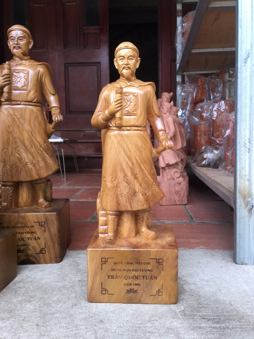 - Kích thước cao 60×20×15cm Tượng trần quốc tuấn trần hương đạo vương được điêu khắc trạm trổ vô cùng tỉ mỉ ,tinh sảo kỳ công .Đi hầu hết tất cả mọi chi tiết góc ngách nội dung hoa văn của tượng đều được gọt tỉa chỉnh sửa hoàn toàn bằng tay thủ công .Đồng thời tượng được kiểm định kỹ lưỡng khắt khe ,như cho vào thẩm sấy cho gỗ khô kiệt .Mục đích trống dập nứt vênh mo mối mọt .Kết hợp với trà nhám, đánh giấy giáp nhiều nước sờ mát lạnh .Rồi cho vào phun lót làm ,bóng mờ để giữ lại mầu sắc vân gỗ tự nhiên .Tượng được làm và hoàn thiện do bàn tay khối óc tài hoa .Từ những người thợ giàu kinh nghiệm ,Cũng như tay nghề cao trong làng nghề truyền thống .Chính vì thế tượng trần quốc tuấn ,trần hưng đạo vương đã đáp ứng đầy đủ những tiêu trí ( Đẹp bền rẻ ) Thẩm mỹ nghệ thuật với chất lượng tuyệt vời