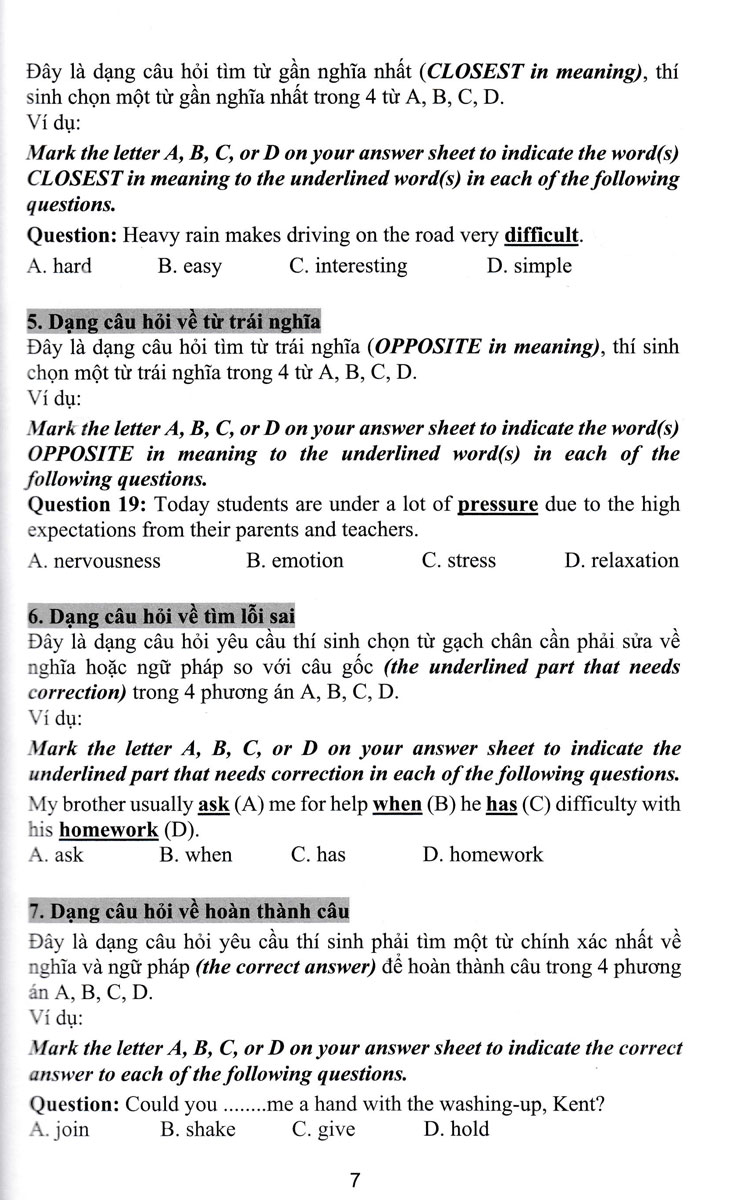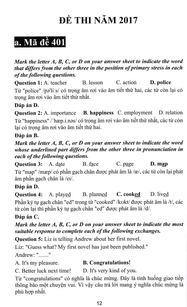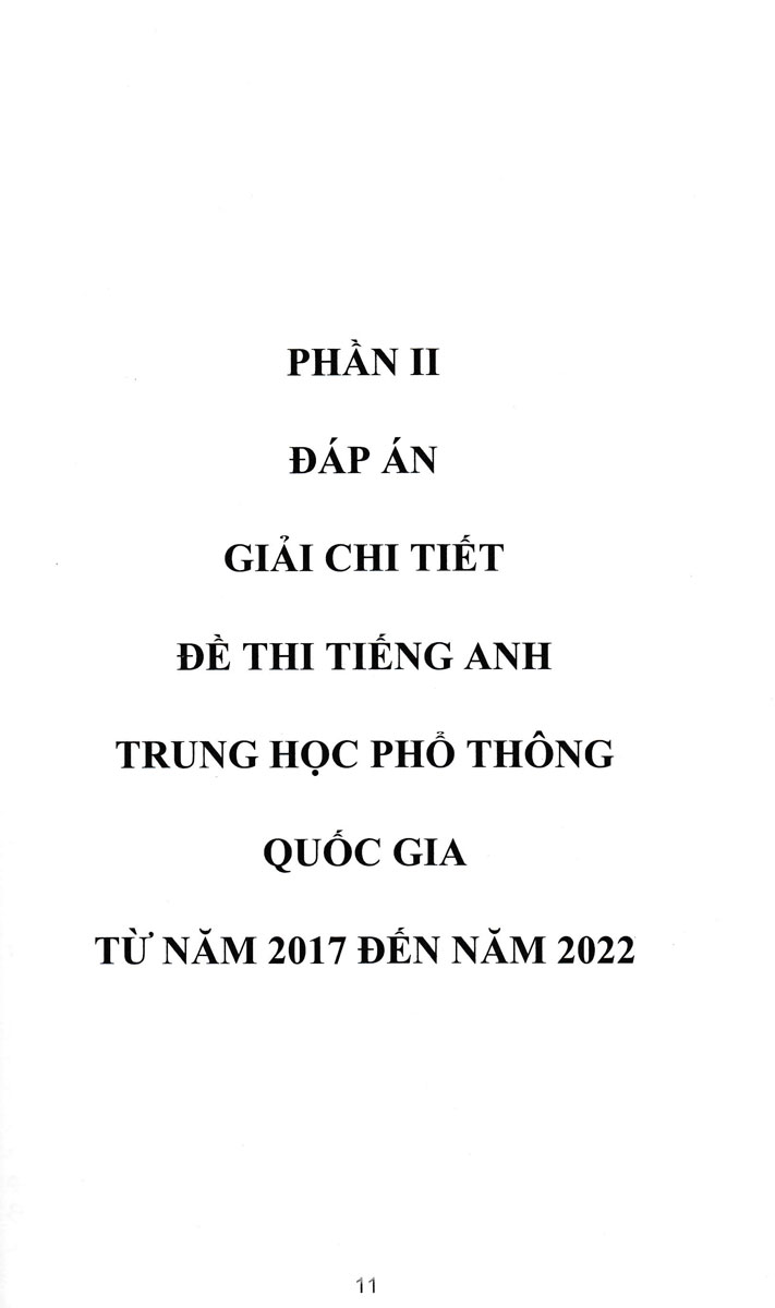 Bên cạnh đó, sách còn tổng hợp đề thi từ 2017 - 2022 có đáp án và lời giải chi tiết. Đây chính là cơ hội để sĩ tử làm bài thi thử đúng cấu trúc đề ra. Luyện đề nhiều còn tăng tốc độ làm bài, cải thiện điểm thi Tiếng Anh THPT Quốc Gia rõ rệt.