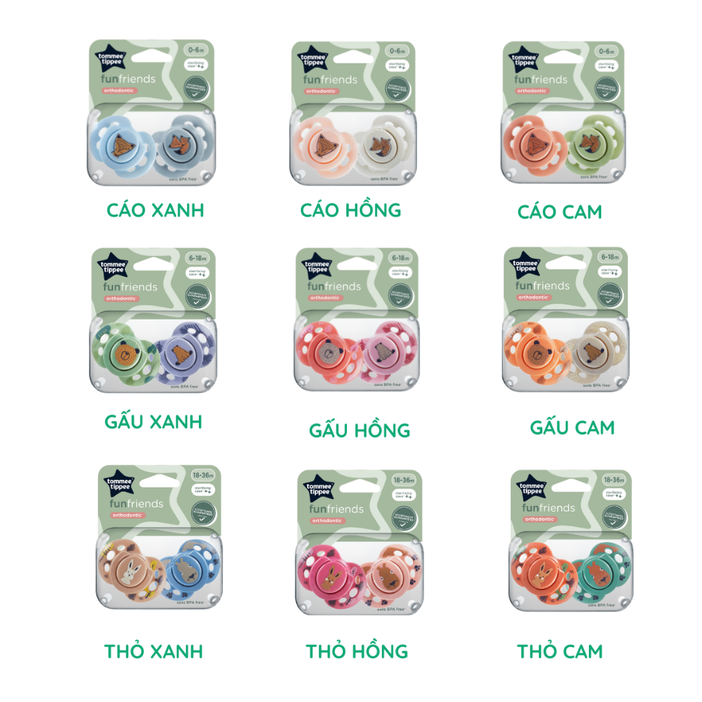 Tên sản phẩm: Ty Ngậm Vui Nhộn Cho Bé Tommee Tippee Fun-Friends 0-6, 6-18, 18-36 Tháng (Vỉ Đôi)