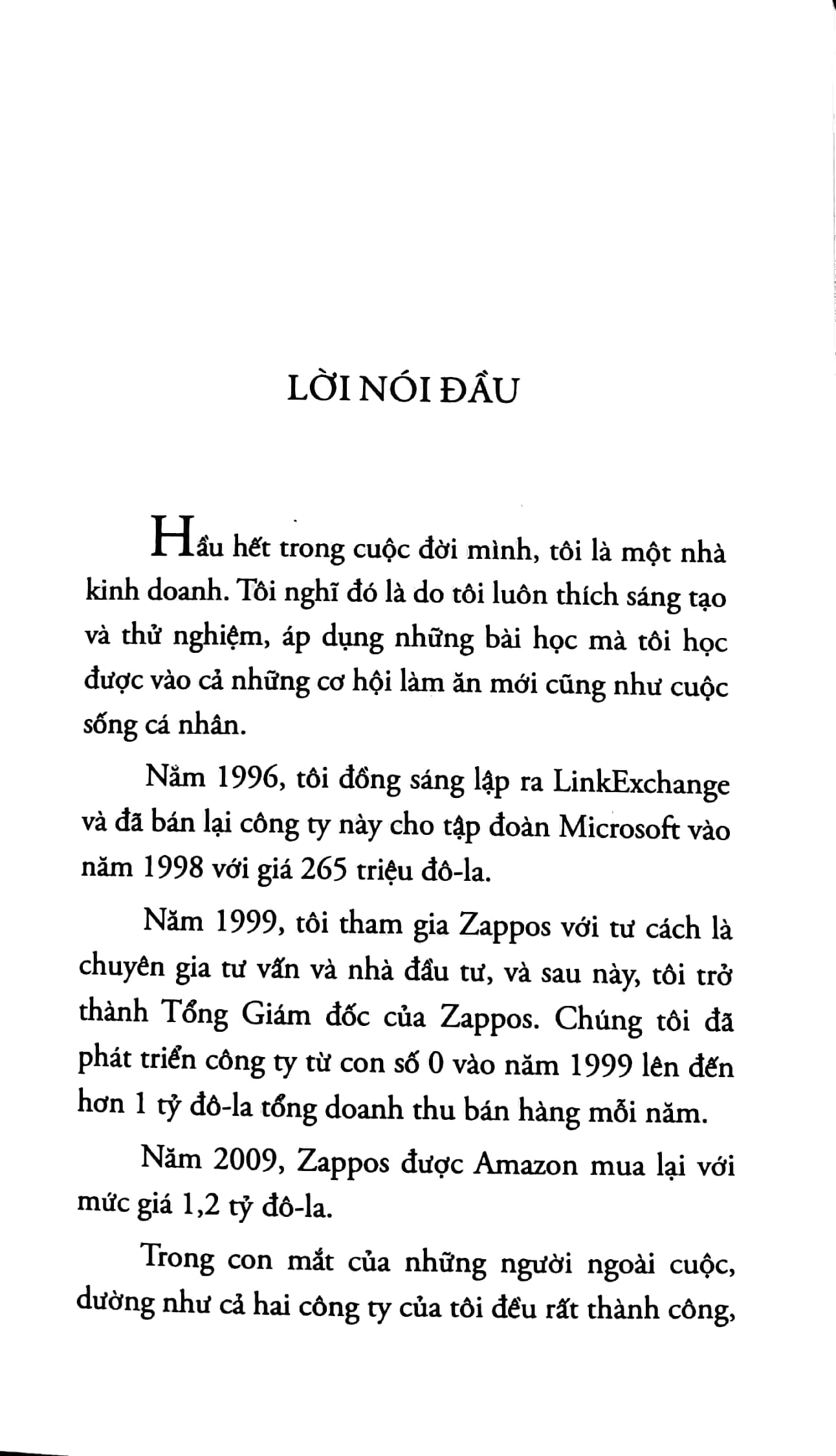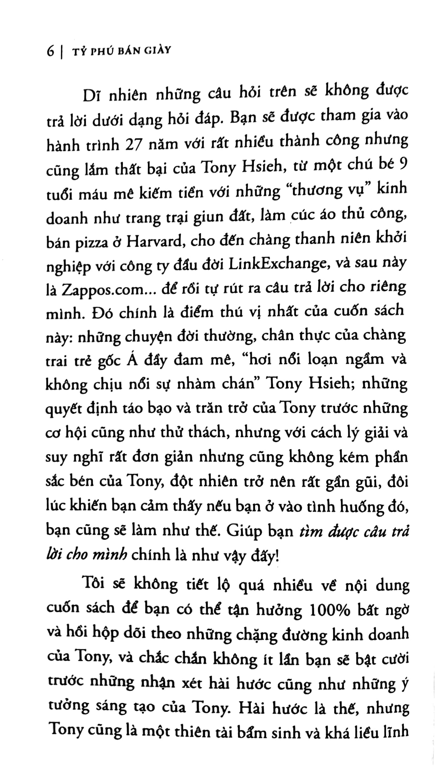 Tỷ Phú Bán Giày không phải là một cuốn sách dạy cách làm giàu tuần tự theo các bước 1 - 2 - 3, cũng không hẳn là một cuốn sách chỉ dẫn bí quyết kinh doanh hay nghệ thuật quản lý. Là hành trình tìm ra chân lý của Hạnh phúc, Đam mê và Lợi nhuận, Tỷ Phú Bán Giày kể câu chuyện về thành công và thất bại của tác giả từ những thương vụ kinh doanh được từ khi 9 tuổi. Những trang trại giun đất, làm cúc áo thủ công, bán pizza ở Harvard, đã trở thành nền móng cho một LinkExchange và sau này là Zappos lừng danh.Với Tỷ Phú Bán Giày, người đọc sẽ nhận được cảm hứng, nhiệt tình và cả một chút điên rồ cho những ý tưởng kinh doanh mà nghe qua tưởng như rất liều mạng. Nhưng với Zappos, Tony Hsieh đã tạo dựng được một thương hiệu về "văn hóa công ty" - chìa khóa thành công để theo đuổi một môi trường làm việc năng động và những dịch vụ xuất sắc.Là cuốn sách bán chạy nhất trên trang A: xếp thứ 1 trong các sách về Dịch vụ khách hàng; xếp thứ 5 trong các sách về Marketing và Bán hàng; và xếp thứ 7 trong các sách về Quản lý.Cuốn sách là một câu chuyện về một doanh nghiệp thành công, trong đó, Tony Hseih chia sẻ những bài học kinh doanh khác nhau mà ông đã học được trong cuộc đời, từ một quầy bán nước chanh và cửa hàng bán pizza cho tới LinkExchange, Zappos.Hsieh – CEO của Zappos đã trưởng thành từ một cậu sinh viên làm kinh doanh của trường Harvard non nớt thành nhà sáng lập của một thương hiệu cực kỳ lớn mạnh sau những năm tháng làm việc như một kẻ lập dị về lĩnh vực dot com và đã có những lúc tưởng như khánh kiệt và phải bán hết các tài sản mà anh có để có vốn hoạt động. Sau khi bán công ty mạng LinkExchange cho Yahoo! vào năm 1999 với 265 triệu đô la, Heish đã tham gia sáng lập Zappos và giúp công ty này đạt được tăng trưởng ngoạn mục, với doanh thu hơn 1 tỉ đô la.Tính đến khi Zappos được mua lại bởi Amazon với hơn 1.2 tỉ đô la vào năm 2009, Hsieh và nhóm cộng sự của anh đã xây dựng được văn hoá doanh nghiệp độc đáo với việc tập trung vào việc trao quyền lực cho nhân viên và lời hứa đem lại hạnh phúc thông qua sự hài lòng của khách hàng và một nơi làm việc tốt đẹp.Tỉ phú bán giày - Câu chuyện về công ty Z được Amazon mua lại với giá 1.2 tỉ đô (Delivering Happiness) là một câu chuyện về một doanh nghiệp thành công, trong đó, Tony Hseih chia sẻ những bài học kinh doanh khác nhau mà ông đã học được trong cuộc đời, từ một quầy bán nước chanh và cửa hàng bán pizza cho tới LinkExchange, Zappos…Ông cũng đã lý giải việc tập trung vào văn hoá doanh nghiệp có thể dẫn tới những thành công không thể ngờ như thế nào: khiến dịch vụ khách hàng trở thành nhiệm vụ của toàn công ty, không phải chỉ một bộ phận; tập trung vào văn hoá doanh nghiệp như ưu tiên số 1; áp dụng nghiên cứu từ khoa học về hạnh phúc vào việc điều hành doanh nghiệp; giúp nhân viên trưởng thành trong cuộc sống và sự nghiệp.Cuối cùng, ông cho chúng ta thấy hiệu quả của việc dùng sự hạnh phúc như một khuôn khổ có thể tạo ra lợi nhuận, đam mê, và mục đích trong cả công việc và trong cuộc sống. Trên A, "Tỉ phú bán giày - Câu chuyện về công ty Z được Amazon mua lại với giá 1 tỉ đô" xếp thứ 23 trong số 100 các cuốn sách bán chạy nhất, xếp thứ nhất trong các sách bán chạy nhất về Quản lý, xếp thứ nhất trong các cuốn sách bán chạy nhất về Dịch vụ khách hàng và xếp thứ nhất trong các cuốn sách về kỹ năng Truyền thông.“Cuốn sách này thật đáng kinh ngạc. Cách mà Tony giúp doanh thu của Zappos tăng trưởng đến 1 tỉ đô la trong 10 năm mới chỉ là sự khởi đầu. Từ việc gây vốn tới việc tìm kiếm được hạnh phúc, từ các thư từ thực tế tới các checklists đều mang đúng nghĩa của nó. Đặc biệt cá nhân và đặc thiết thực.”