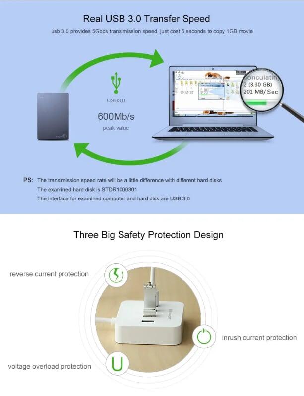 1. Input: USB 3.0 A Male 2. Output: USB 3.0 A Female × 4 3. Speed up to 5Gbps 4. Support 10 TB hard drive 5. With USB-C power port DC 5V 6. plug &