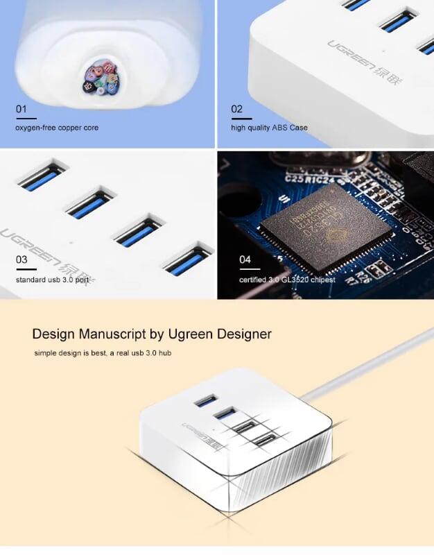 Mua tại TiktokUgreen 30202 1m usb 3.0 4 ports hub trắng cr118