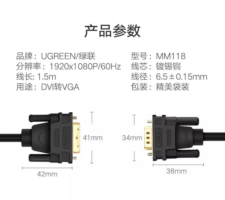 Ugreen 30838 Cáp chuyển DVI 24+1 dương sang VGA dương dài 1.5m DVI 24+1 to VGA Male to Male MM118 1. Length : 1.5M 2. Color : Black 3. Cable DVI 24+1 to VGA Male