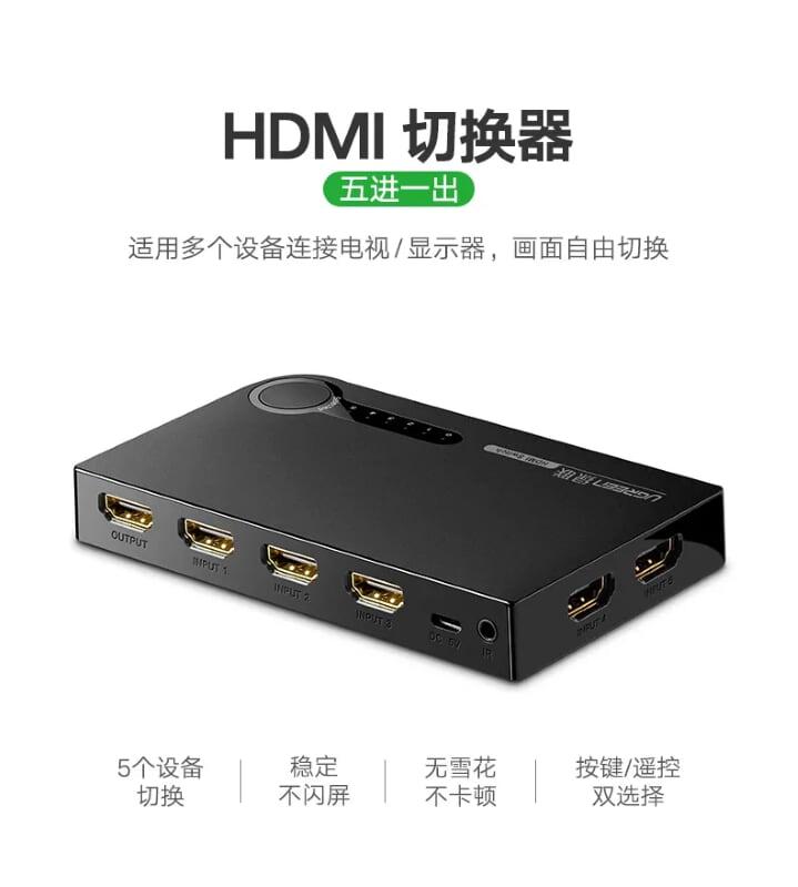 Bộ chuyển HDMI 5 vào 1 ra hỗ trợ 3D full HD chính hãng Ugreen 40205