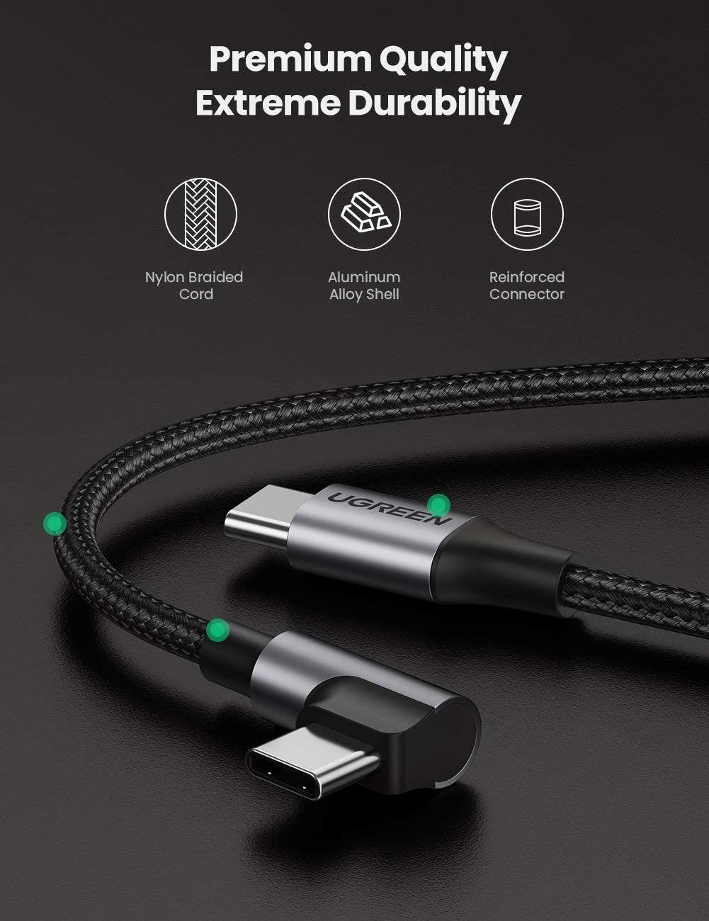 - The USB Type C to C Fast Charge Cable adopts a smart 90-degree right angled connector to avoid bending while playing games and the interference with the adjacent ports on your device.