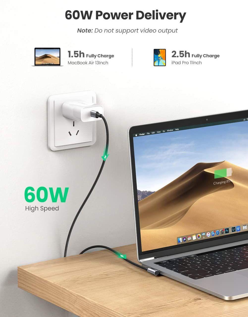 - The USB C to USB C Power Cable delivers max 60W(20V/3A) fast charging to Type C/Thunderbolt 3 laptops/tablets/phones, when paired with 96W/87W/65W/45W/18W USB Power Delivery charger. Fully recharge MacBook Air 13" in 1.5h, as fast as the original cable.