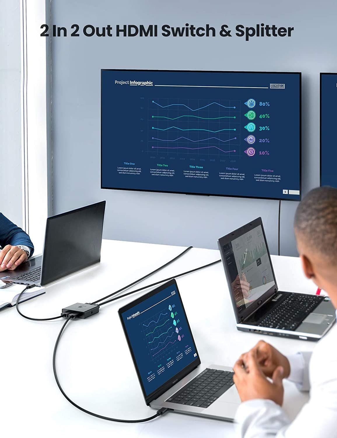 1. UGREEN 2 IN 4 OUT HDMI switcher offers an easy solution for you to share 2 devices to 4 monitors such as Mac book, PC with your HDTV for video output, saves the cables