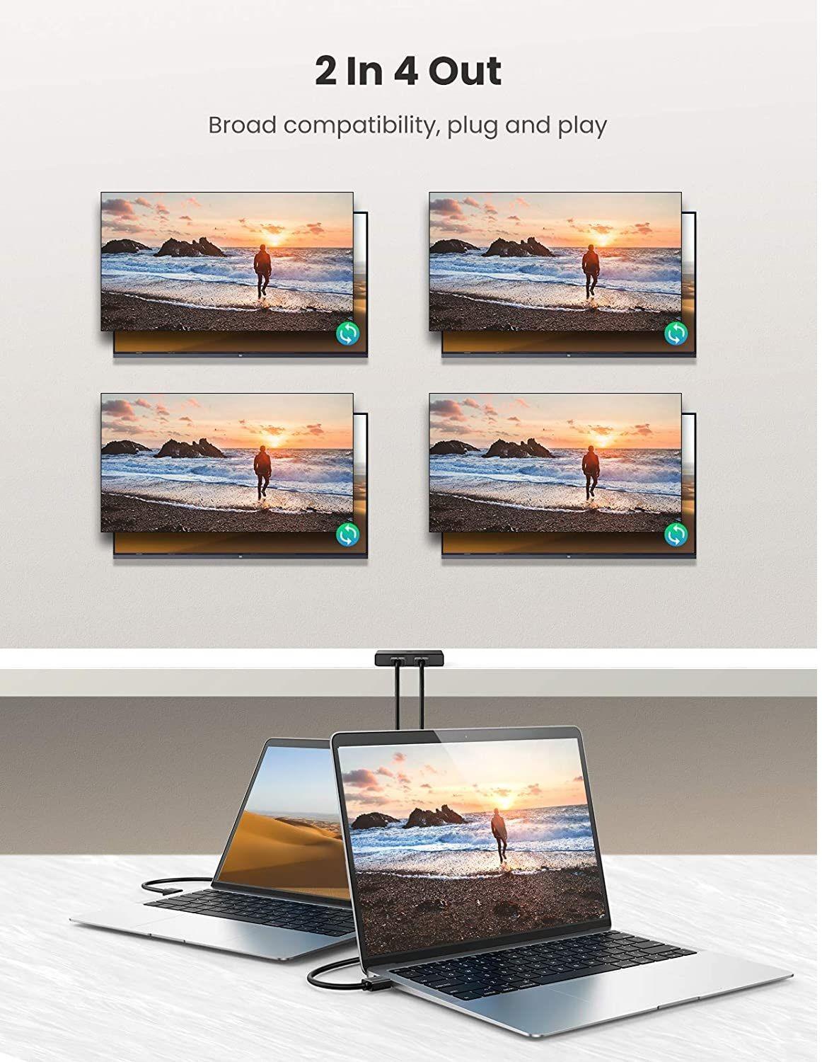 1. UGREEN 2 IN 4 OUT HDMI switcher offers an easy solution for you to share 2 devices to 4 monitors such as Mac book, PC with your HDTV for video output, saves the cables