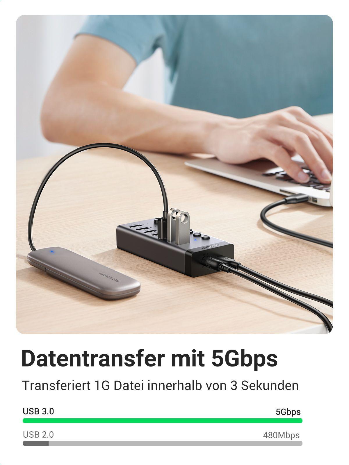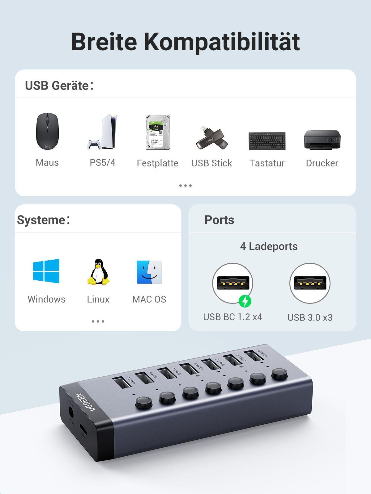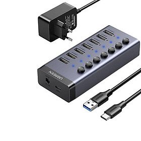 ✨Ugreen UG90307CM481TK hub ra 7 cổng USB 3.0 + Adapter 12v-2A có hỗ trợ truyền dữ liệu và sạc có kèm dây USB type C chuẩn cắm EU chân tròn Bộ chia Màu Xám - HÀNG CHÍNH HÃNG
