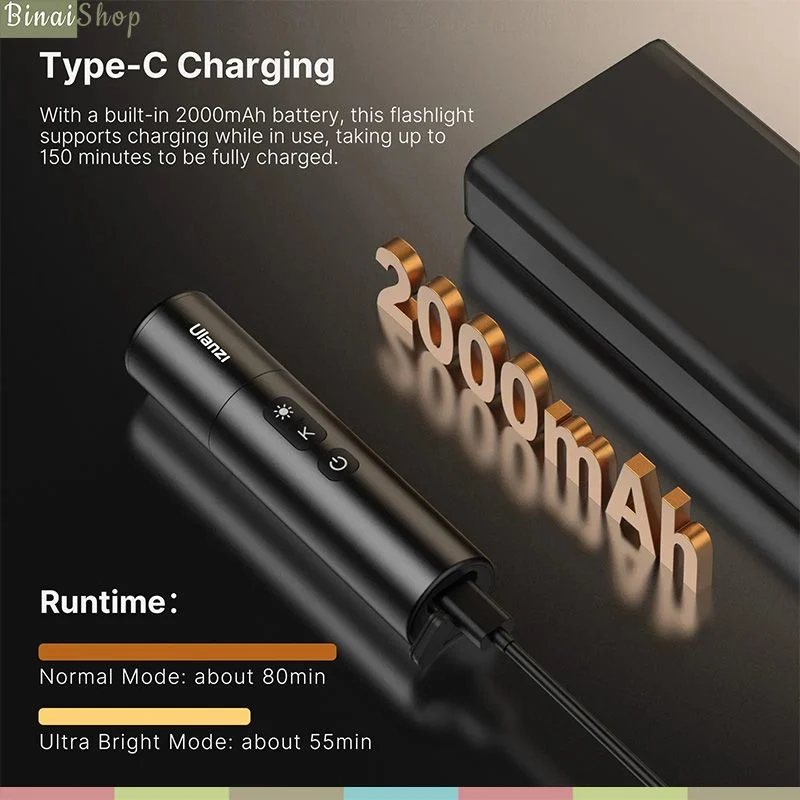 • Sử dụng pin Luthium dung lượng 2000mAh với cổng sạc Type-c thời gian sử dụng lên đến 80 phút ở chế độ thường và 55 phút ở chế độ siêu sáng. Thời gian sạc đầy 150 phút.