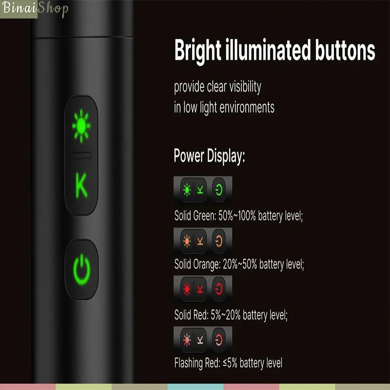 • Nút bấm nguồn tích hợp đèn cung cấp khả năng hiển thị trong môi trường ánh sáng yếu, kèm theo 5 chế độ báo đèn thể hiện mức pin khác nhau.