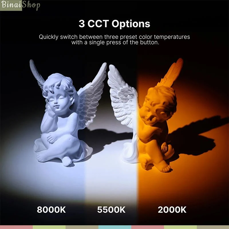 • Dải nhiệt rộng 2000-8000K, kiểm soát độ sáng từ 0% - 100% theo 4 mức khác nhau, CRI 90+ cao cho màu sắc bão hoà gần màu gốc hơn.