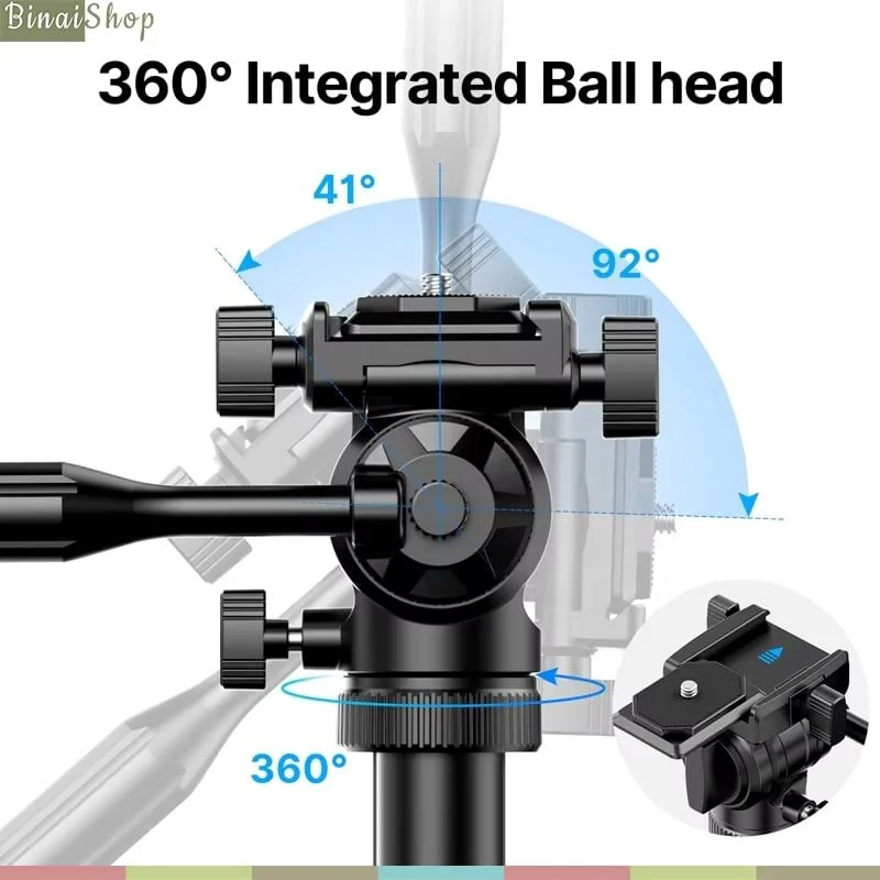 - Ballhead có thể tháo rời và xoay ngang 360 độ bằng tay cầm, xoay dọc từ 40 độ đến 90 độ mang lại nhiều góc khác nhau.