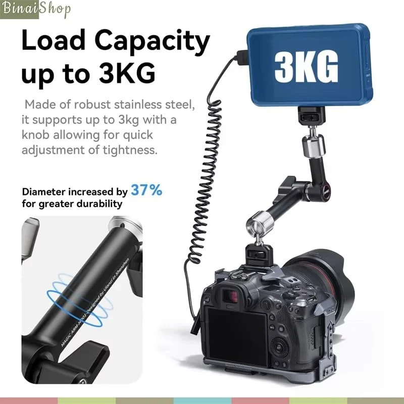 - Khả năng chịu tải 3kg của khớp nối mang lại nhiều lựa chọn mở rộng như gắn máy ảnh, kẹp điện thoại, đèn, micro, màn hình chụp cỡ nhỏ,...
