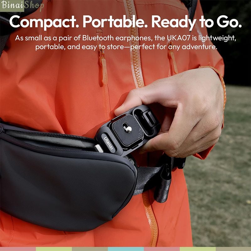 - Ulanzi UKA07 thiết kế nhỏ gọn, bền từ hợp kim nhôm CNC, nặng 94g, chịu tải 10kg, kẹp và tháo lắp nhanh balo/thắt lưng, khóa kẹp 3 mức ôm chắc dây 10mm×70mm với lót silicone