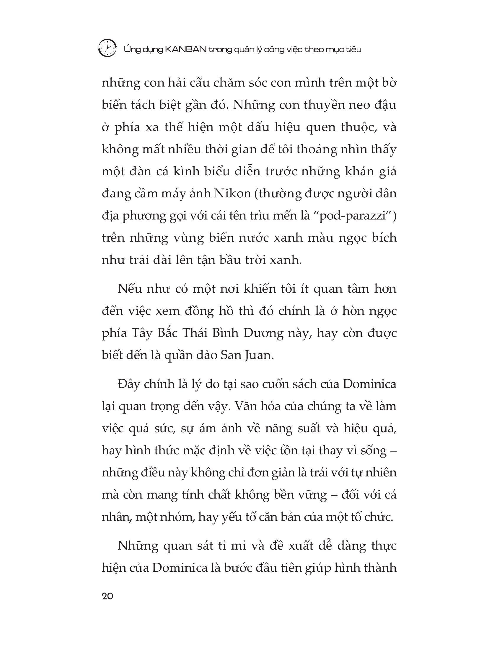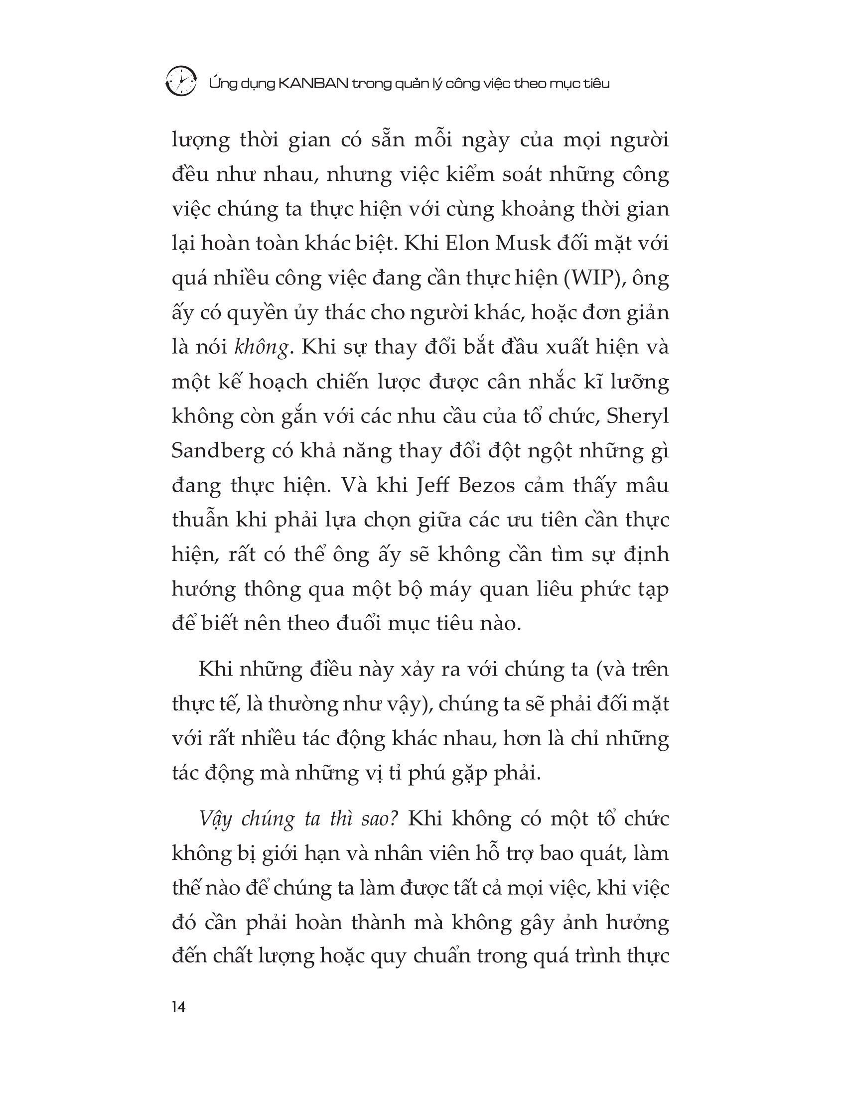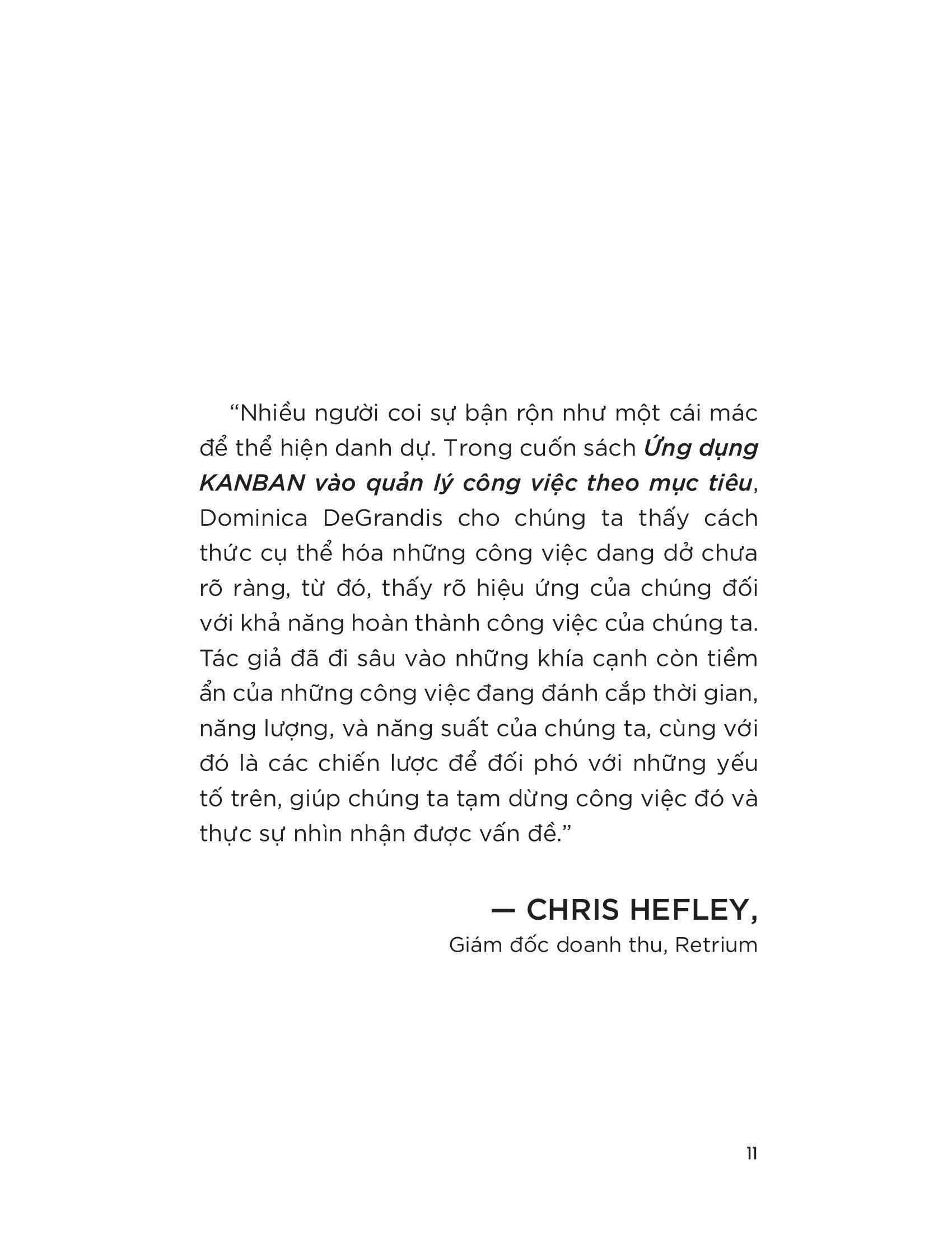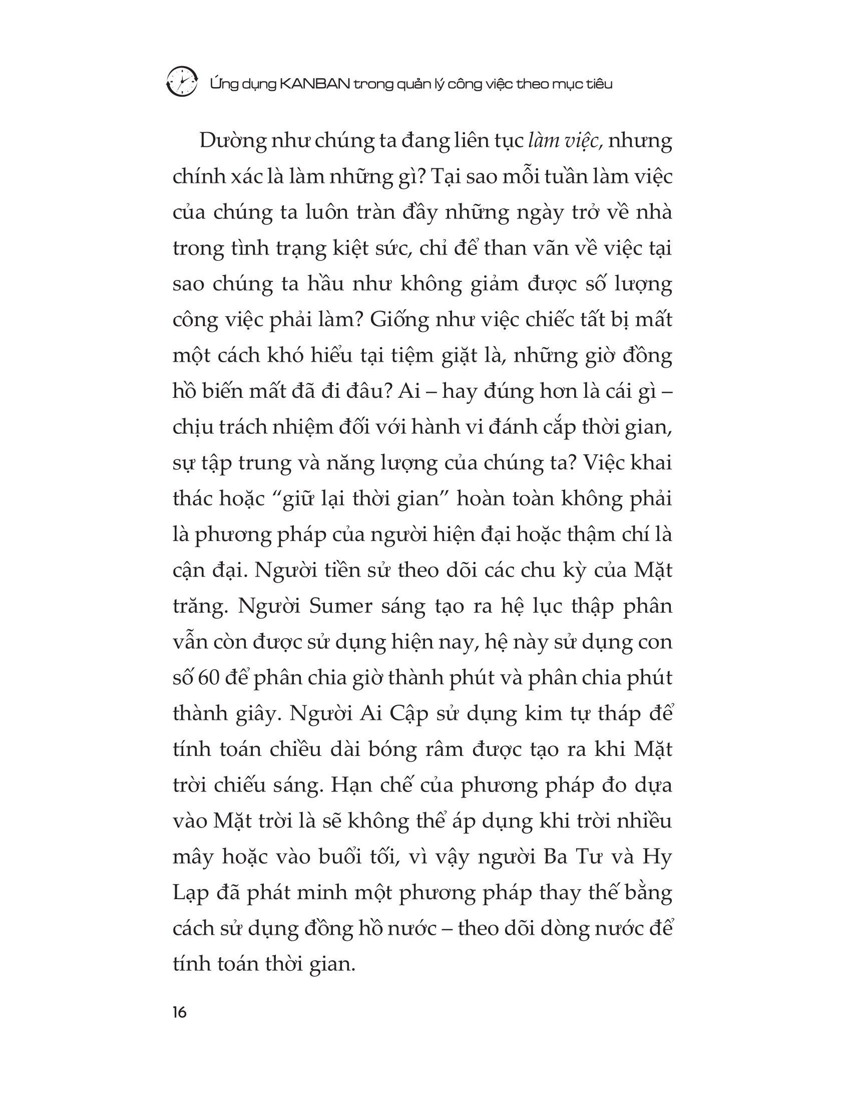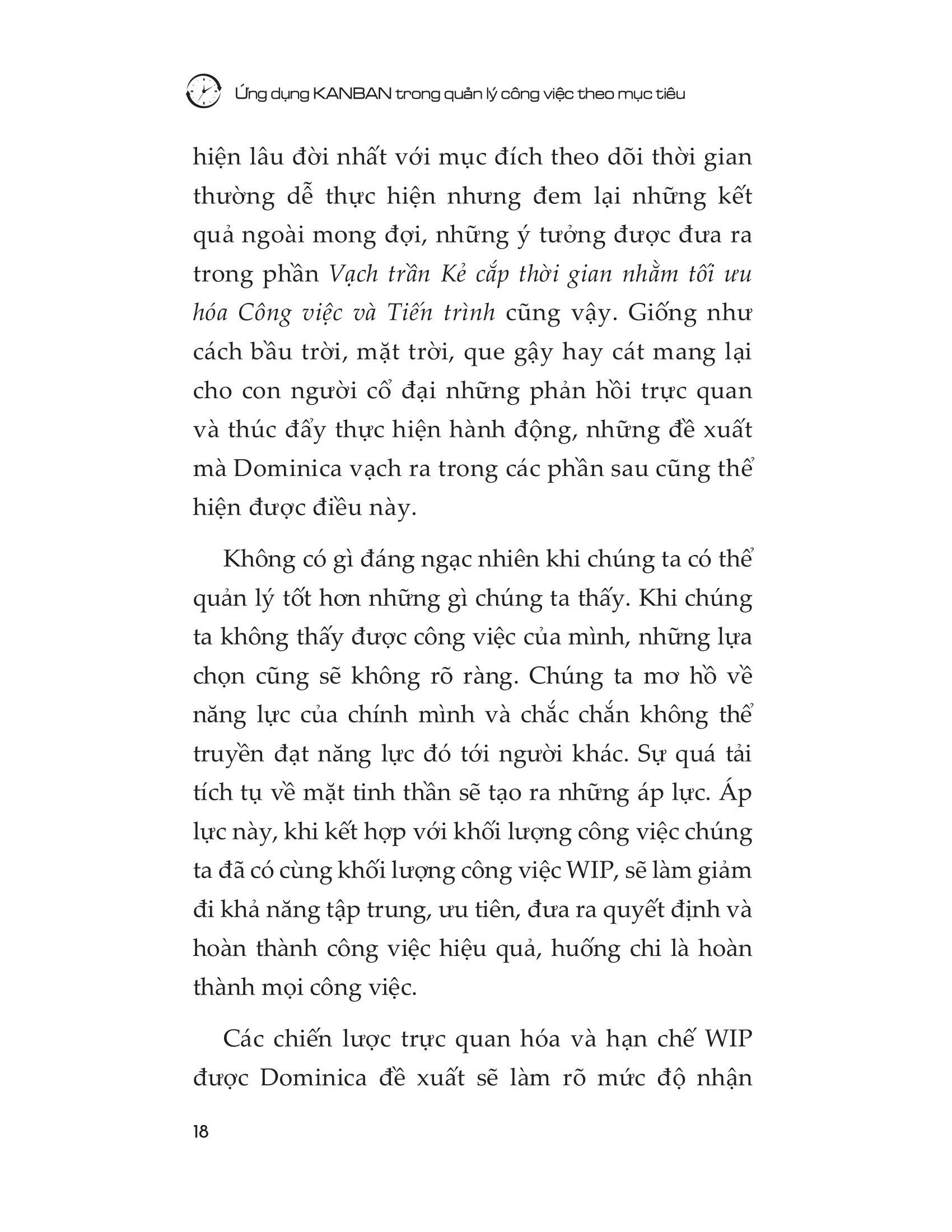 Ứng Dụng Kanban Trong Quản Lý Công Việc Theo Mục Tiêu Dường như chúng ta đang liên tục làm việc, nhưng chính xác là làm những gì? Tại sao mỗi tuần làm việc của chúng ta luôn tràn đầy những ngày trở về nhà trong tình trạng kiệt sức, chỉ để than vãn về việc: tại sao chúng ta hầu như không giảm được số lượng công việc phải làm? Bất chấp mọi “sự tiện lợi” hiện đại của chúng ta, việc quản lý thời gian hiệu quả đối với nhiều người lại là một cuộc chiến khó khăn, một mục tiêu đòi hỏi rất nhiều nguồn lực nếu không muốn nói là viển vông. Mặc dù nền kinh tế thông tin mở ra sự liên kết 24/7, nó cũng sinh ra những kỳ vọng liên tục, và từ đó xuất hiện nghịch lý là, công nghệ như điện thoại di động, hay hội nghị trực tuyến – những công cụ tưởng chừng giúp cuộc sống trở nên dễ dàng hơn – lại biến chúng ta thành nô lệ phụ thuộc vào chúng. Vì vậy, có thể thấy một tình trạng chung là chúng ta làm việc liên tục nhưng công việc vẫn bị trì hoãn. Câu hỏi cấp thiết cần đặt ra là, "Chính xác chúng ta đang làm gì?" Công việc luôn tự mở rộng ra để chiếm đủ lượng thời gian được ấn định cho nó. Đó là lý do chúng ta cần một hệ thống tác động, trong đó mọi người có thể tập trung vào một việc với thời gian đủ lâu để hoàn thành nó trước bắt đầu một việc mới – như phương pháp Kanban. Kanban là một hệ thống tác động trực quan dựa trên những ràng buộc cho phép người lao động nhận thêm công việc khi họ nhàn rỗi, thay vì công việc bị đẩy cho họ bất chấp khối lượng công việc hiện tại. Với Kanban, chúng ta có thể nhận diện và loại bỏ những “kẻ cắp thời gian”, những yếu tố gây sao nhãng, từ đó giúp chúng ta tập trung và hoàn thành công việc theo đúng mục tiêu.