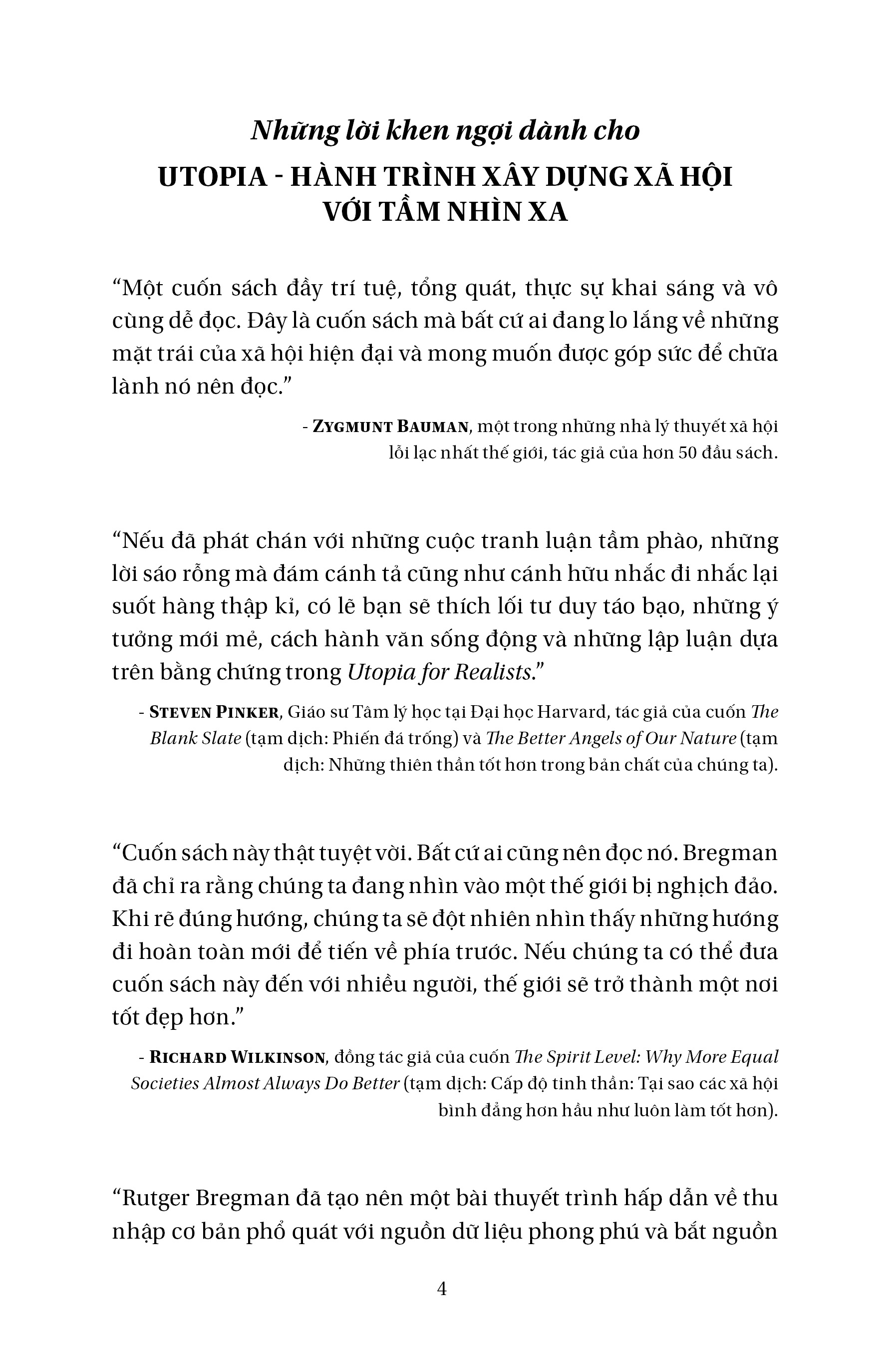 Trong cuốn sách này, Rutger Bregman đã phân tích, lí giải hàm ý của Utopia, thuật lại quá trình nảy sinh ra tư tưởng Utopia trong lịch sử và cả ý nghĩa tích cực cũng như tính tất yếu của xã hội. Nghèo đói, bất công, những điều này đều khơi dậy khao khát của con người đối với “Miền đất của sự dư thừa” (The Land of Plenty), đồng thời nỗ lực hết mình để đạt được điều đó. Trong thực tiễn chính trị xã hội hiện đại cũng tồn tại một vài trải nghiệm mang màu sắc Utopia, ví như “Dự luật thu nhập cơ bản” của cựu tổng thống Mỹ Richard Nixon. Quan niệm dẫn dắt hành động, và nếu chúng ta kiên trì thực hiện hành động trong thời gian dài thì nó sẽ trở thành hiện thực. Đây cũng chính là ý nghĩa của Utopia.
