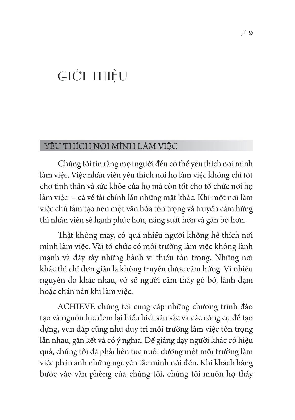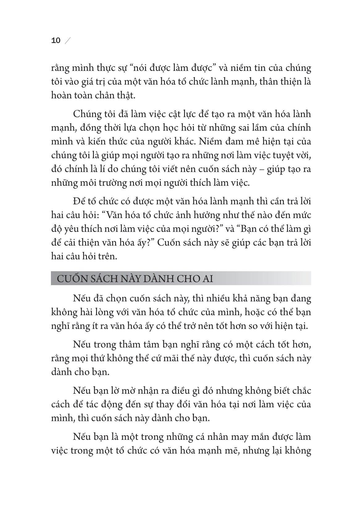 Với cuốn sách này, bạn sẽ: KHÁM PHÁ 6 YẾU TÔ CƠ BẢN TẠO NÊN MỘT VĂN HÓA TỔ CHỨC LÀNH MẠNH Văn hóa tổ chức là gì? Hầu hết chúng ta đều biết những câu chuyện từ một số nơi “tuyệt nhất” để làm việc – những Google của thế giới, với những khu ăn uống đáng ngưỡng mộ, những tòa nhà lộng lẫy, dịch vụ mát-xa miễn phí và những bàn chơi bi lắc. Những người ra quyết định ở nhiều công ty kể trên có thể cảm thấy các đãi ngộ thêm này sẽ giúp tổ chức của mình trở thành nơi làm việc tuyệt vời, và kết quả là họ sẽ thu hút cũng như giữ chân được những nhân viên tài năng, nhiệt tình, hiệu quả. Những sáng kiến này nghe có vẻ tuyệt vời, và quả thực chúng có thể giúp tạo ra nhiều tổ chức vui vẻ và hiệu quả hơn. Tuy nhiên, thực tế là hầu hết các công ty không có đủ nguồn lực để triển khai những chương trình kiểu này. Điều đáng mừng là, dù nghe có vẻ hay ho song những đãi ngộ này không thực sự cần thiết để thu hút được những nhân viên hiệu quả và tận tâm, những người yêu thích công việc và trung thành với tổ chức mình. Thay vào đó, điều mấu chốt là xây dựng một văn hóa tổ chức lành mạnh. Xây dựng văn hóa trong tổ chức như thế nào? Nếu bạn muốn biến tổ chức của mình thành một nơi làm việc tuyệt vời, văn hóa phải được ưu tiên hàng đầu. Ngay cả khi tổ chức của bạn cân nhắc đến phòng chơi game hay đồ ăn sang chảnh miễn phí, thì chỉ riêng những đãi ngộ này thôi cũng sẽ không thể tạo nên một văn hóa lành mạnh nếu như bạn không tính đến cả những ưu tiên được nêu ra trong 6 chương của cuốn sách: Truyền đạt mục đích & các giá trị của mình. Nhân viên được truyền cảm hứng khi họ đồng điệu với mục đích và các giá trị của tổ chức nơi họ làm việc. Mang lại công việc có ý nghĩa. Hầu hết nhân viên muốn làm việc trong những dự án truyền cho họ cảm hứng, phù hợp với thế mạnh của họ và giúp họ phát triển. Hướng đội ngũ lãnh đạo tập trung vào con người. Cách lãnh đạo kết nối với nhân viên ảnh hưởng lớn đến cách mọi người cảm nhận về nơi họ làm việc. Xây dựng các mối quan hệ có ý nghĩa. Khi nhân viên yêu quý đồng nghiệp và cấp trên, họ sẽ cảm thấy thỏa mãn và gắn bó với công việc hơn. Tạo ra các nhóm làm việc có hiệu quả đỉnh cao. Mọi người tràn đầy năng lượng khi làm việc hiệu quả cùng nhau vì các nhóm đạt được những thành tích mà không một cá nhân nào có thể tự mình làm được. Tiến hành quản lí xung đột trên tinh thần xây dựng. Khi lãnh đạo không thể xử lí tốt và kịp thời xung đột, thì xung đột sẽ nhanh chóng hủy hoại nơi làm việc. Văn hóa tổ chức là yếu tố quan trọng nhất ảnh hưởng đến hạnh phúc, các mối quan hệ công việc và mức độ hài lòng với công việc. Hiểu rõ văn hóa tổ chức là gì và văn hóa tổ chức của chính nơi bạn làm việc là gì sẽ giúp bạn dễ dàng xác định các vấn đề và phát triển các chiến lược để tạo nên một văn hóa tốt đẹp hơn, đồng thời tận dụng được năng lượng tích cực của văn hóa đó. Văn hóa tổ chức bao gồm các yếu tố như giá trị, sứ mệnh, phong cách lãnh đạo, kì vọng vào cách nhân viên cư xử với khách hàng và cư xử với nhau. Văn hóa hiện hữu qua cách con người tương tác với nhau – hành vi của họ. Văn hóa được phản ảnh qua cách mọi việc được hoàn thành. Văn hóa cấu tạo từ những nguyên tắc và chuẩn mực gắn kết tổ chức lại thành một khối. CUỐN SÁCH NÀY DÀNH CHO AI? Nếu đã chọn cuốn sách này, thì nhiều khả năng bạn đang không hài lòng với văn hóa tổ chức của mình, hoặc có thể bạn nghĩ rằng ít ra văn hóa ấy có thể trở nên tốt hơn so với hiện tại. Nếu trong thâm tâm bạn nghĩ rằng có một cách tốt hơn, rằng mọi thứ không thể cứ mãi thế này được, thì cuốn sách này là dành cho bạn. Nếu bạn lờ mờ nhận ra điều gì đó nhưng không biết chắc cách để tác động đến sự thay đổi văn hóa tại nơi làm việc của mình, thì cuốn sách này là dành cho bạn. Nếu bạn là một trong những cá nhân may mắn được làm việc trong một tổ chức có văn hóa mạnh mẽ, nhưng lại không biết chắc cách để duy trì sức mạnh đó khi bạn phát triển, thay đổi và đối mặt với tương lai, thì cuốn sách này là dành cho bạn. Nếu bạn là một nhà lãnh đạo muốn chủ động trau dồi một văn hóa tổ chức lành mạnh, thì cuốn sách này là dành cho bạn. Lãnh đạo chịu phần lớn trách nhiệm cho tình trạng của văn hóa tổ chức, nhưng mọi người ở tổ chức đều có một vai trò trong việc tác động và duy trì văn hóa đó. Xuyên suốt cuốn sách, chúng tôi sử dụng cụm từ “nhà lãnh đạo” theo nghĩa bao hàm để chỉ tất cả những người có ảnh hưởng đến người khác tại nơi làm việc. Cuốn sách này có thể áp dụng cho người giám sát, quản lí, giám đốc, quản lí nhân sự, đại biểu công đoàn và những