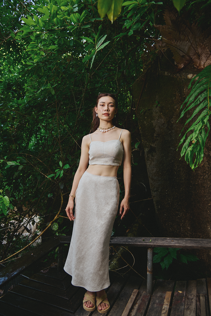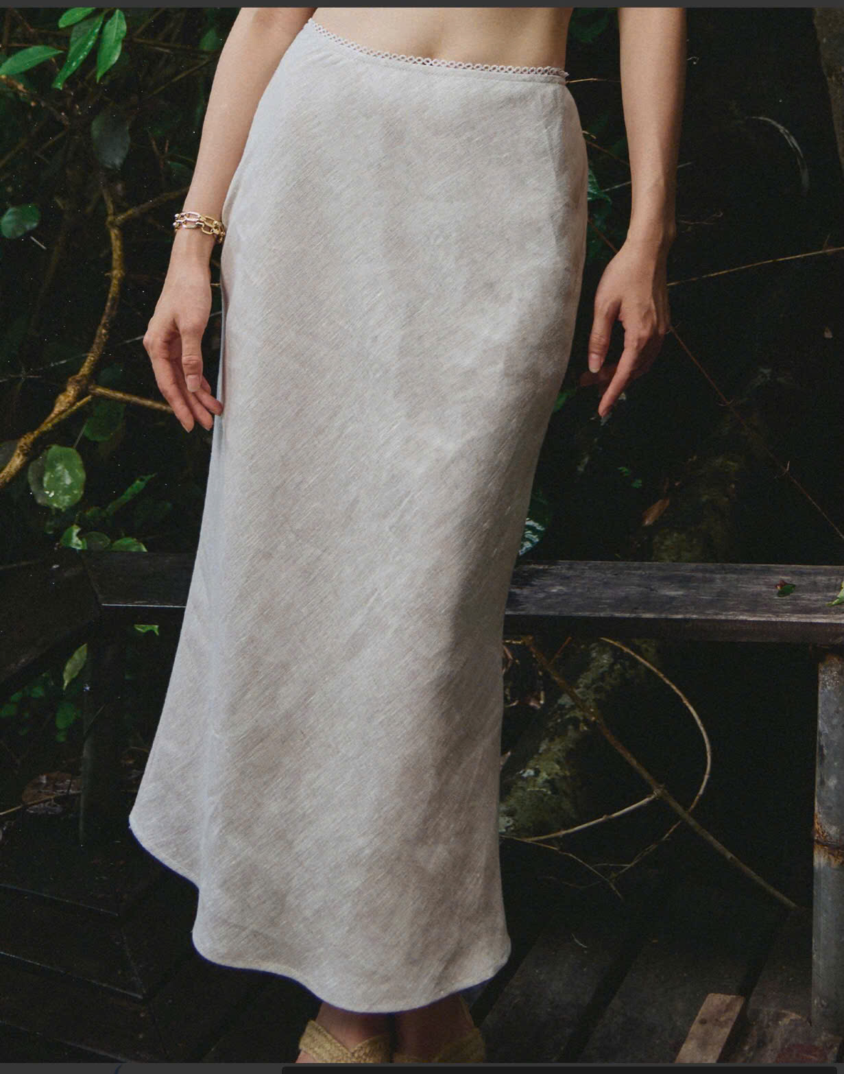 Được thực hiện trên nền chất liệu linen, chân váy midi Lanh tạo cảm giác thoải mái, thoáng mát và gần gũi với thiên nhiên. Kiểu dáng dài suông, có chút đuôi cá nhẹ nhàng, lưng cao tối giản mà lại cực kỳ tôn dáng, tạo hiệu ứng kéo dài đôi chân và mang lại sự mềm mại, uyển chuyển trong từng bước đi. Chi tiết viền ren ở phần lưng váy tạo điểm nhấn tinh tế.