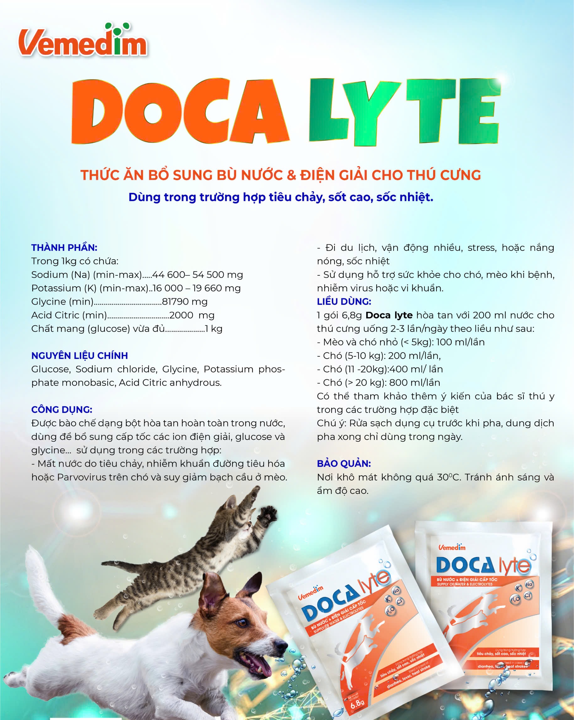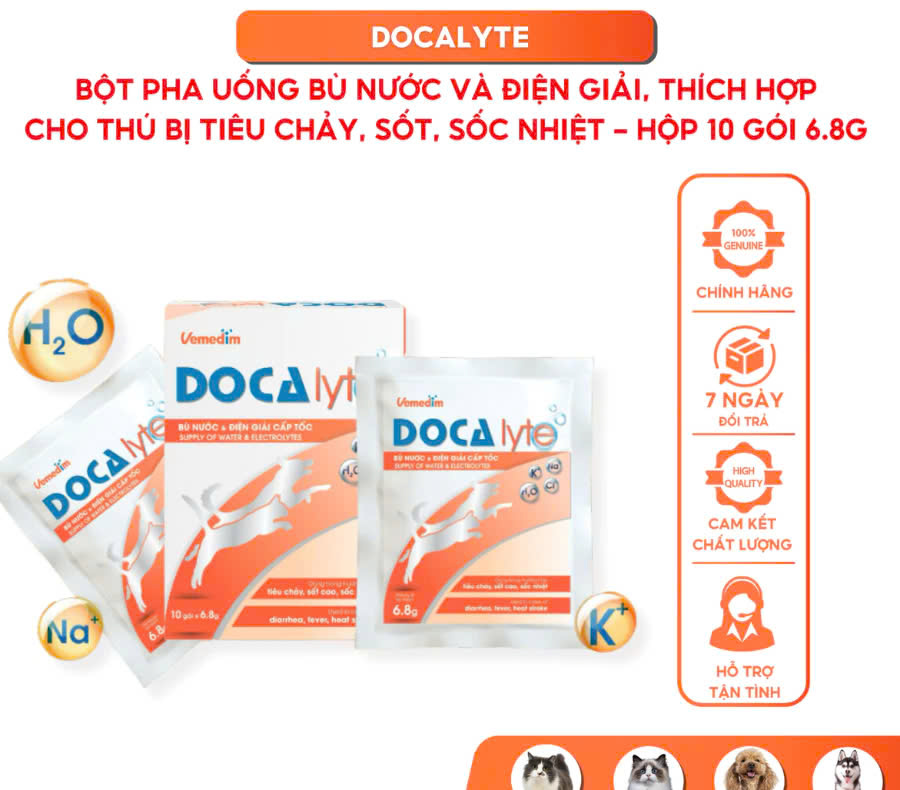 - Sử dụng hỗ trợ sức khỏe cho chó, mèo khi bệnh, nhi3m v1rus hoặc vi khuẩn. LIỀU DÙNG: 1 gói 6,8g Doca lyte hòa tan với 200 ml nước cho thú cưng uống 2-3 lần/ngày theo liều như sau: